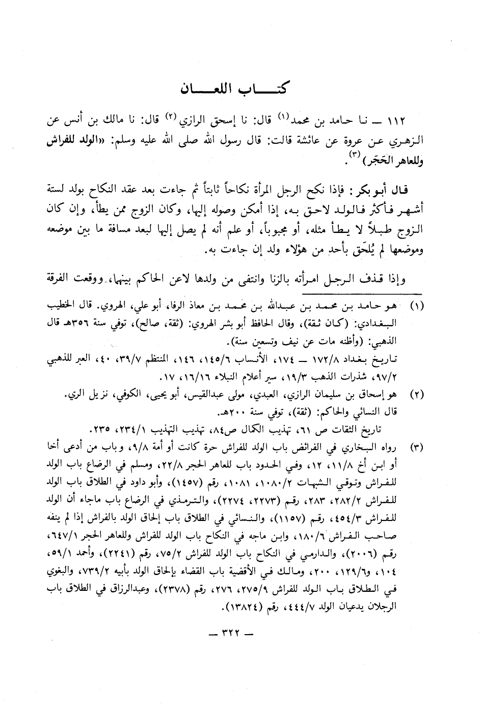 112 - نا حَامِدُ بْنُ مُحَمَّدٍ، قَالَ: نا إِسْحَاقُ الرَّازِيُّ، قَالَ: نا مَالِكُ بْنُ أَنَسٍ، عَنِ الزُّهْرِيِّ، عَنْ عُرْوَةَ، عَنْ عَائِشَةَ، قَالَتْ: قَالَ رَسُولُ اللَّهِ صَلَّى اللَّهُ عَلَيْهِ وَسَلَّمَ: «الْوَلَدُ لِلْفِرَاشِ وَلِلْعَاهِرِ الْحَجَرُ»