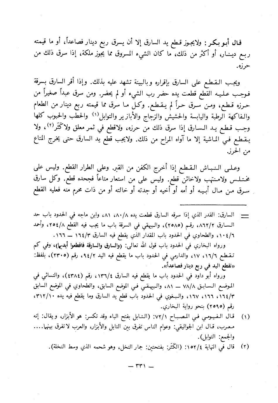 وَلا يجوز قطع يد السارق إلا أن يسرق ربع دينار فصاعدًا أو مَا قيمته ربع دينار أو أكثر من ذَلِكَ مَا كَانَ الشيء المسروق مما يجوز ملكه إذا سرق ذَلِكَ من حرزه، ويجب القطع عَلَى السارق بإقراره وبالبينة تشهد عليه بذلك.