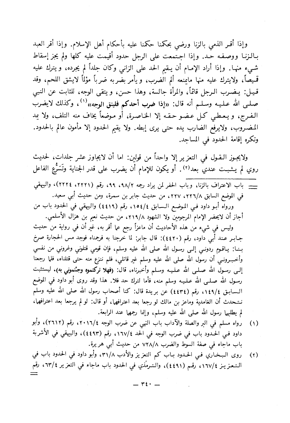 وَلا يمد المضروب، وَلا يرفع الضارب يده حَتَّى يرى إبطه، وَلا يقيم الحدود إلا مأمون عالم بالحدود، وتكره إقامة الحدود في المساجد، وَلا يجوز القول في التعزيز إلا واحدًا من قولين: إما أن لا يجاوز عشر جلدات لحديث روي لم يثبت عندي بعد، أو يكون للإمام أن يضرب عَلَى قدر الجناية، وشروع الفاعل