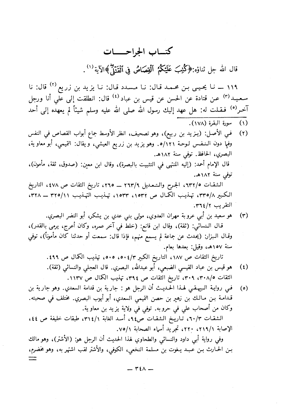 119 - نا يَحْيَى بْنُ مُحَمَّدٍ، قَالَ: نا مُسَدَّدٌ، قَالَ: نا يَزِيدُ بْنُ رَبِيعٍ، قَالَ: نا سَعِيدٌ، عَنْ قَتَادَةَ، عَنِ الْحَسَنِ، عَنْ قَيْسِ بْنِ عُبَادَةَ، قَالَ: انْطَلَقْتُ إِلَى عَلِيٍّ أَنَا وَرَجُلٌ آخَرُ، فَقُلْتُ لَهُ: هَلْ عَهِدَ إِلَيْكَ رَسُولُ اللَّهِ صَلَّى اللَّهُ عَلَيْهِ وَسَلَّمَ شَيْئًا لَمْ يَعْهَدْهُ إِلَى أَحَدٍ.