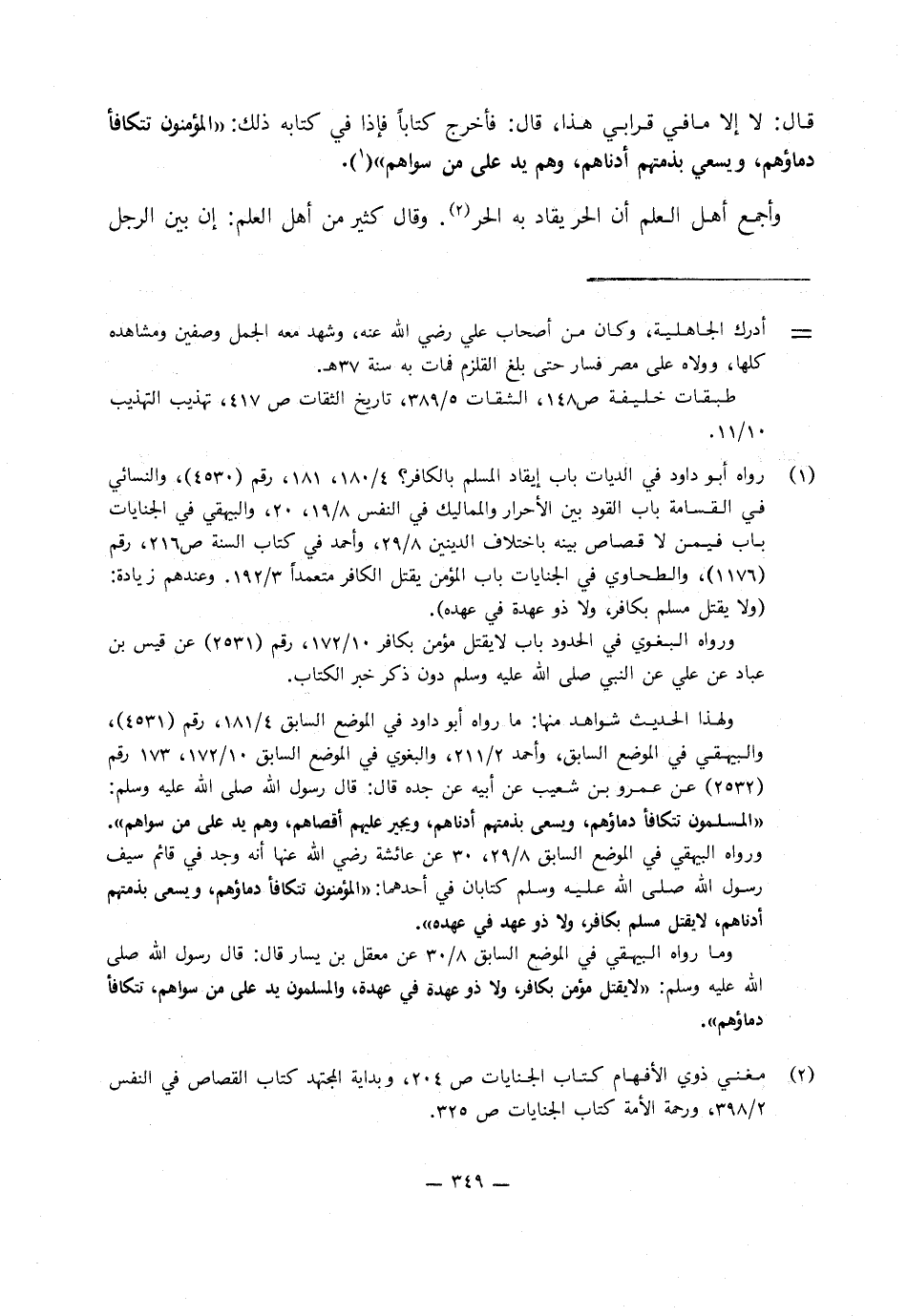 فَإِذَا فِي كتابهِ ذَلِكَ: «الْمُؤْمِنُونَ تَتَكَافَأُ دِمَاؤُهُمْ وَيَسْعَى بِذِمَّتِهِمْ أَدْنَاهُمْ وَهُمْ يَدٌ عَلَى مَنْ سِوَاهُمْ» ، وَأَجْمَعَ أَهْلُ الْعِلْمِ أَنَّ الْحُرَّ يُقَادُ بِهِ الْحُرَّ