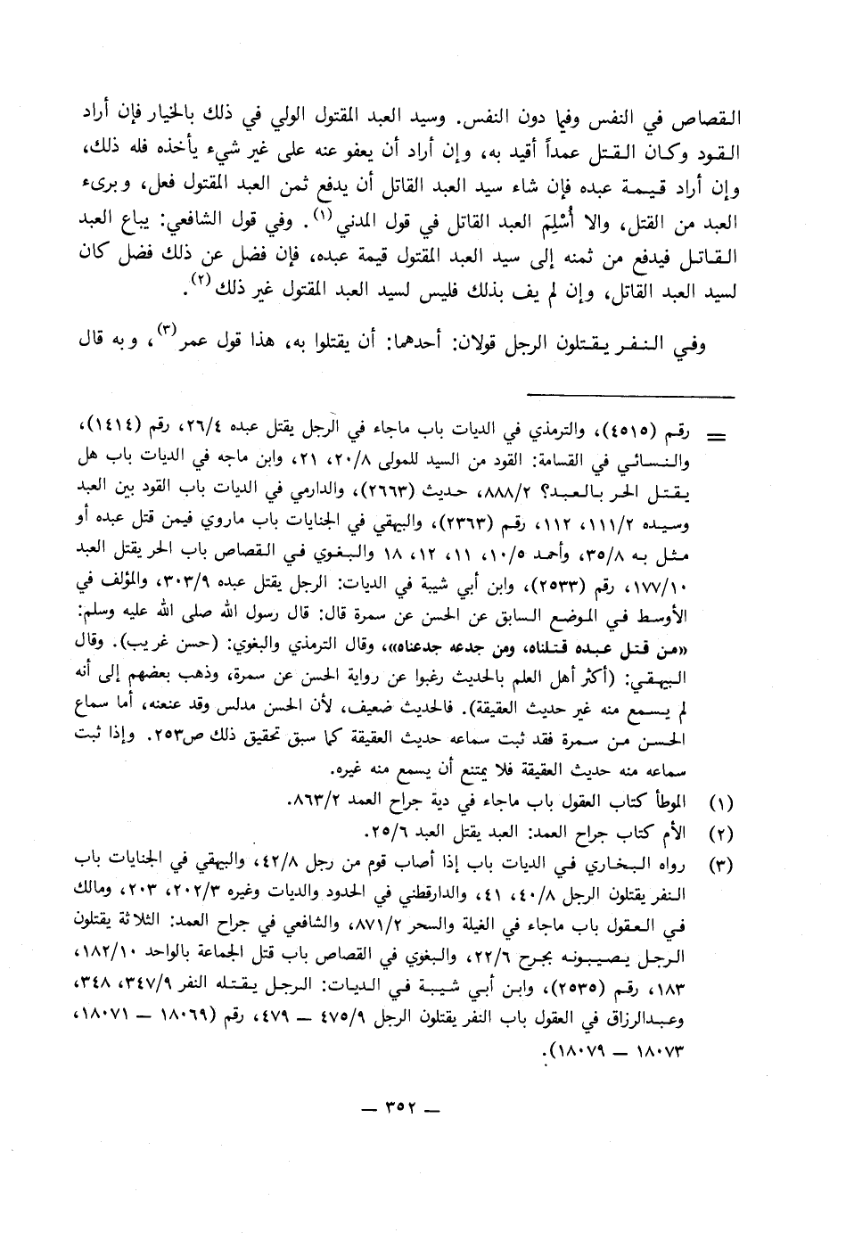 وفي قول الشَّافِعِيّ: يباع العبد القاتل فيدفع من ثمنه إِلَى سيد العبد المقتول قيمة عبده، فإن فضل عن ذَلِكَ فضل كَانَ لسيد العبد القاتل، وإن لم يف بذلك فليس لسيد العبد المقتول غير ذَلِكَ، وفي النفر يقتلون الرجل، قولان: أحدهما: أن يقتلوا به هذا قول عمر، وبه قَالَ: