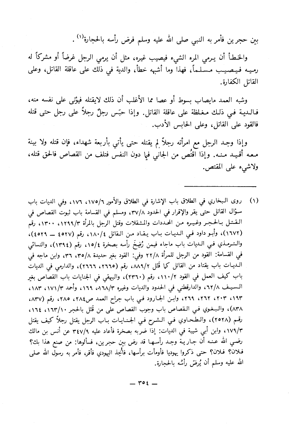 وإذا وجد الرجل مع امرأته رجلا لم يقتله حَتَّى يأتي بأربعة شهداء، فإن قتله وَلا بينة مَعَهُ أقيد منه، وإذا اقتص من الجاني فيما دون النفس فتلف من القصاص فالحق قتله، وَلا شيء عَلَى المقتص.