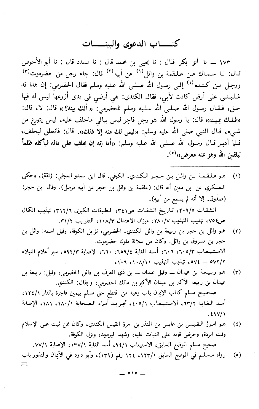 173 - قَالَ: نا يَحْيَى بْنُ مُحَمَّدٍ، قَالَ: نا مُسَدَّدٌ، قَالَ: نا أَبُو الأَحْوَصِ، قَالَ: نا سِمَاكٌ، عَنْ عَلْقَمَةَ بْنِ وَائِلٍ، عَنْ أَبِيهِ، قَالَ: جَاءَ رَجُلٌ مِنْ حَضْرَمَوْتَ، وَرَجُلٌ مِنْ كِنْدَةَ إِلَى رَسُولِ اللَّهِ صَلَّى اللَّهُ عَلَيْهِ وَسَلَّمَ، فَقَالَ الْحَضْرَمِيُّ: إِنَّ هَذَا قَدْ غَلَبَنِي عَلَى أَرْضٍ كَانَتْ لأَبِي، فَقَالَ الْكِنْدِيُّ: هِيَ أَرْضِي فِي يَدِي أَزْرَعُهَا لَيْسَ لَهُ فِيهَا حَقٌّ.