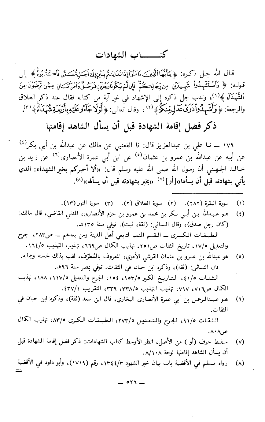 وندب جل ذكره إِلَى الإشهاد فِي غير آية من كتابه، فَقَالَ عند ذكر الطلاق والرجعة: {وَأَشْهِدُوا ذَوَيْ عَدْلٍ مِنْكُمْ} [الطلاق: 2] ، وقال تعالى: {لَوْلا جَاءُوا عَلَيْهِ بِأَرْبَعَةِ شُهَدَاءَ} [النور: 13] .