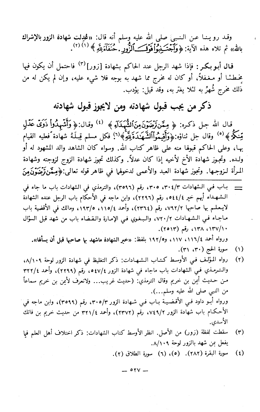 وَقَدْ رُوِّينَا عَنِ النَّبِيِّ صَلَّى اللَّهُ عَلَيْهِ وَسَلَّمَ، أَنَّهُ قَالَ: «عَدَلَتْ شَهَادَةُ الزُّورِ بِالإِشْرَاكِ بِاللَّهِ» .