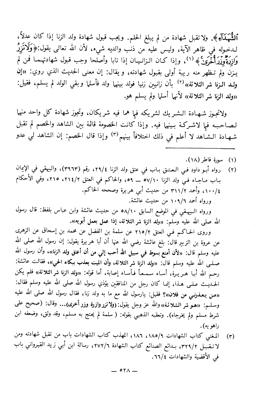 الشُّهَدَاءِ} [البقرة: 282] ، وَلا تقبل شهادة من لم يبلغ الحلم، ويجب قبول شهادة ولد الزنى إذا كَانَ عدلا لدخوله فِي ظاهر الآية، وليس عليه من ذنب والديه شيء لأن اللَّه تعالى يقول: {وَلا تَزِرُ وَازِرَةٌ وِزْرَ أُخْرَى} [الأنعام: 164] .