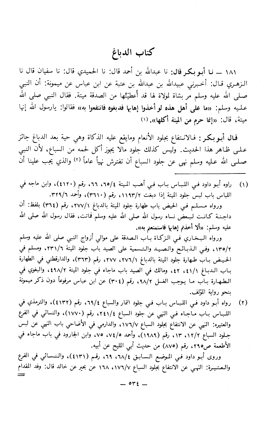 181 - نا عَبْدُ اللَّهِ بْنُ أَحْمَدَ، قَالَ: نا الْحُمَيْدِيُّ، قَالَ: نا سُفْيَانُ، قَالَ: نا الزُّهْرِيُّ، قَالَ: أَخْبَرَنِي عُبَيْدُ اللَّهِ بْنُ عَبْدِ اللَّهِ بْنِ عُتْبَةَ، عَنِ ابْنِ عَبَّاسٍ، عَنْ مَيْمُونَةَ، أَنَّ النَّبِيَّ صَلَّى اللَّهُ عَلَيْهِ وَسَلَّمَ مَرَّ بِشَاةٍ لِمَوْلاةٍ لَهَا قَدْ أُعْطِيَتْهَا مِنَ الصَّدَقَةِ مَيْتَةً، فَقَالَ النَّبِيُّ صَلَّى اللَّهُ عَلَيْهِ وَسَلَّمَ: «مَا عَلَى أَهْلِ هَذِهِ لَوْ أَخَذُوا إِهَابَهَا فَدَبَغُوهُ، فَانْتَفَعُوا بِهِ» .