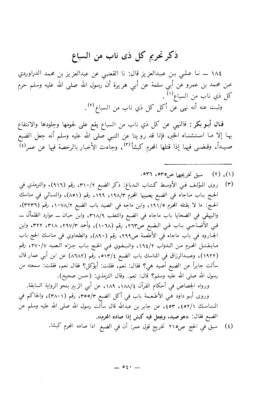 184 - نا عَلِيُّ بْنُ عَبْدِ الْعَزِيزِ، قَالَ: نا الْقَعْنَبِيُّ، عَنْ عَبْدِ الْعَزِيزِ بْنِ مُحَمَّدٍ الدَّرَاوَرْدِيِّ، عَنْ مُحَمَّدِ بْنِ عَمْرٍو، عَنْ أَبِي سَلَمَةَ، عَنْ أَبِي هُرَيْرَةَ، أَنَّ رَسُولَ اللَّهِ صَلَّى اللَّهُ عَلَيْهِ وَسَلَّمَ «حَرَّمَ كُلَّ ذِي نَابٍ مِنَ السِّبَاعِ» ، وَثَبَتَ عَنْهُ، أَنَّهُ «نَهَى عَنْ أَكْلِ كُلِّ ذِي نَابٍ مِنَ السِّبَاعِ»