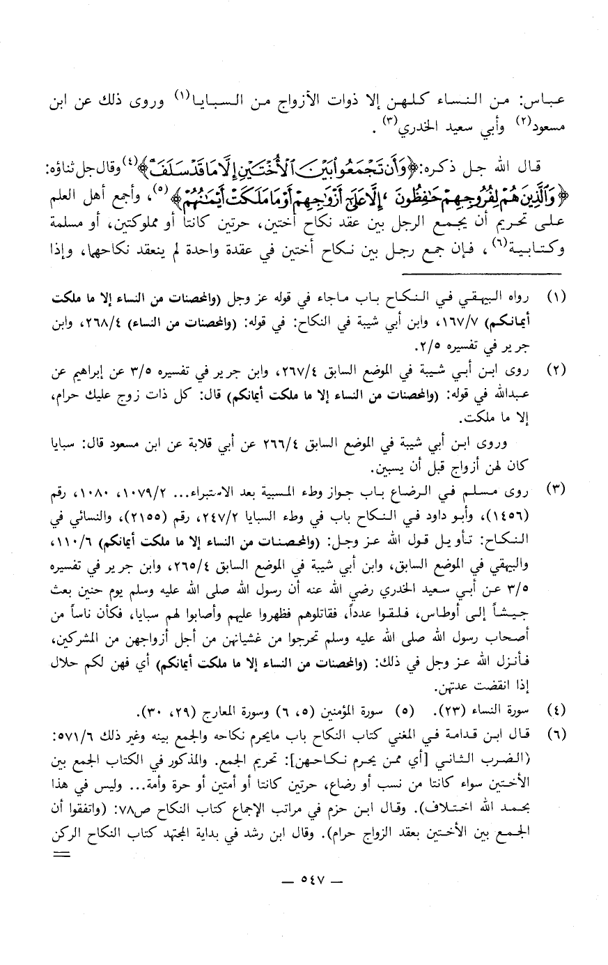 قَالَ جل ذكره: {وَأَنْ تَجْمَعُوا بَيْنَ الأُخْتَيْنِ إِلا مَا قَدْ سَلَفَ} [النساء: 23] ، وقال جل ثناؤه: {وَالَّذِينَ هُمْ لِفُرُوجِهِمْ حَافِظُونَ {5} إِلا عَلَى أَزْوَاجِهِمْ أَوْ مَا مَلَكَتْ أَيْمَانُهُمْ} [المؤمنون: 5-6] .