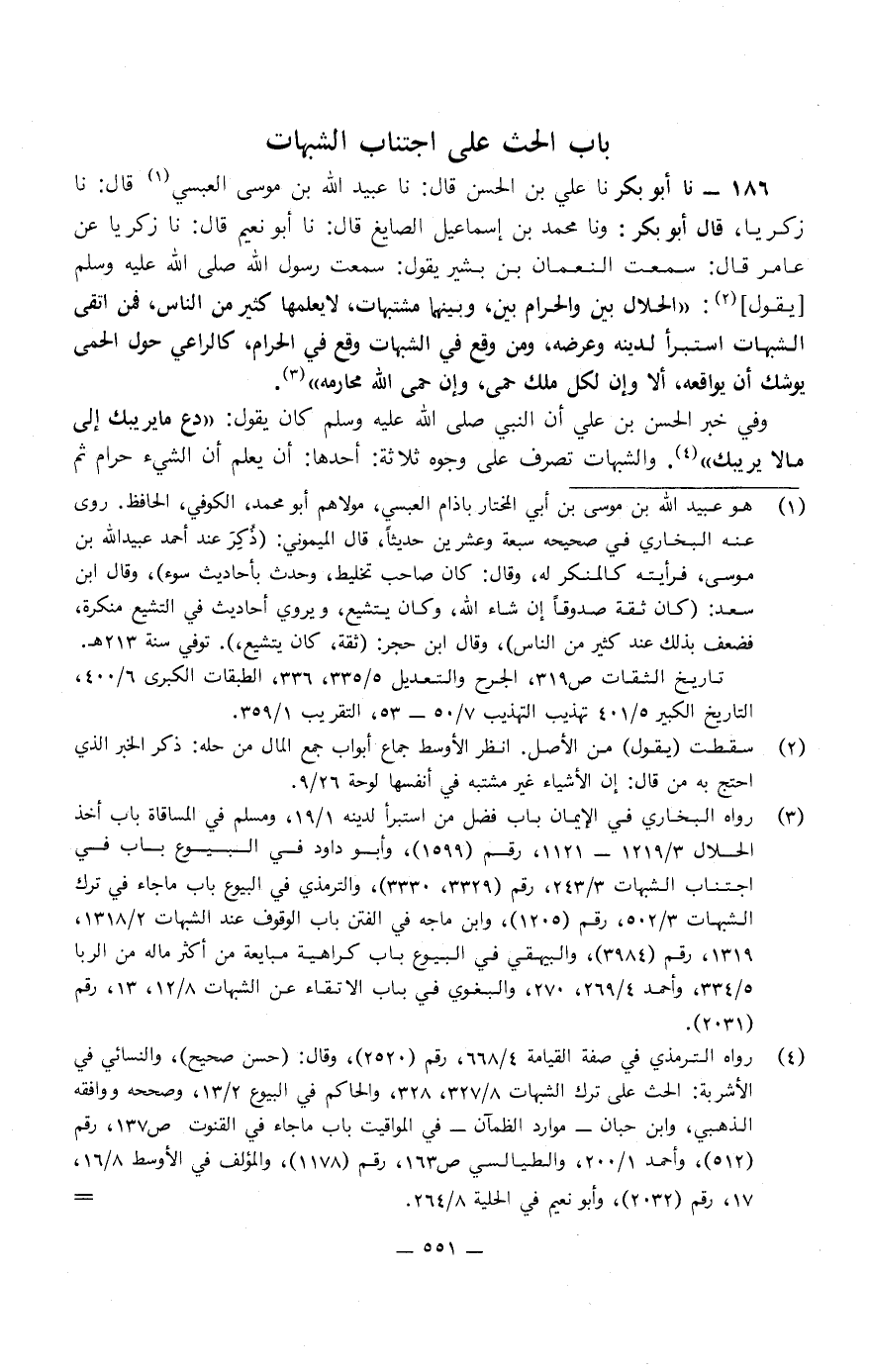 186 - نا عُبَيْدُ اللَّهِ بْنُ مُوسَى الْقَيْسِيُّ، قَالَ: نا زَكَرِيَّا، ونا مُحَمَّدُ بْنُ إِسْمَاعِيلَ الصَّائِغُ، قَالَ: نا أَبُو نُعَيْمٍ، قَالَ: نا زَكَرِيَّا، عَنْ عَامِرٍ، قَالَ: سَمِعْتُ النُّعْمَانَ بْنَ بَشِيرٍ، يَقُولُ: سَمِعْتُ رَسُولَ اللَّهِ صَلَّى اللَّهُ عَلَيْهِ وَسَلَّمَ: «الْحَلالُ بَيِّنٌ وَالْحَرَامُ بَيِّنٌ وَبَيْنَهُمَا مُشَتَبِهَاتٌ لا يَعْلَمُهَا كَثِيرٌ مِنَ النَّاسِ، فَمَنِ اتَّقَى الشُّبُهَاتِ اسْتَبْرَأَ لِدِينِهِ وَعِرْضِهِ، وَمَنْ وَقَعَ فِي الشُّبُهَاتِ وَقَعَ فِي الْحَرَامِ كَالرَّاعِي حَوْلَ الْحِمَى يُوشِكُ أَنْ يُوَاقِعَهُ أَلا وَإِنَّ لِكُلِّ مَلِكٍ حِمًى وَإِنَّ حِمَى اللَّهِ مَحَارِمَهُ» .