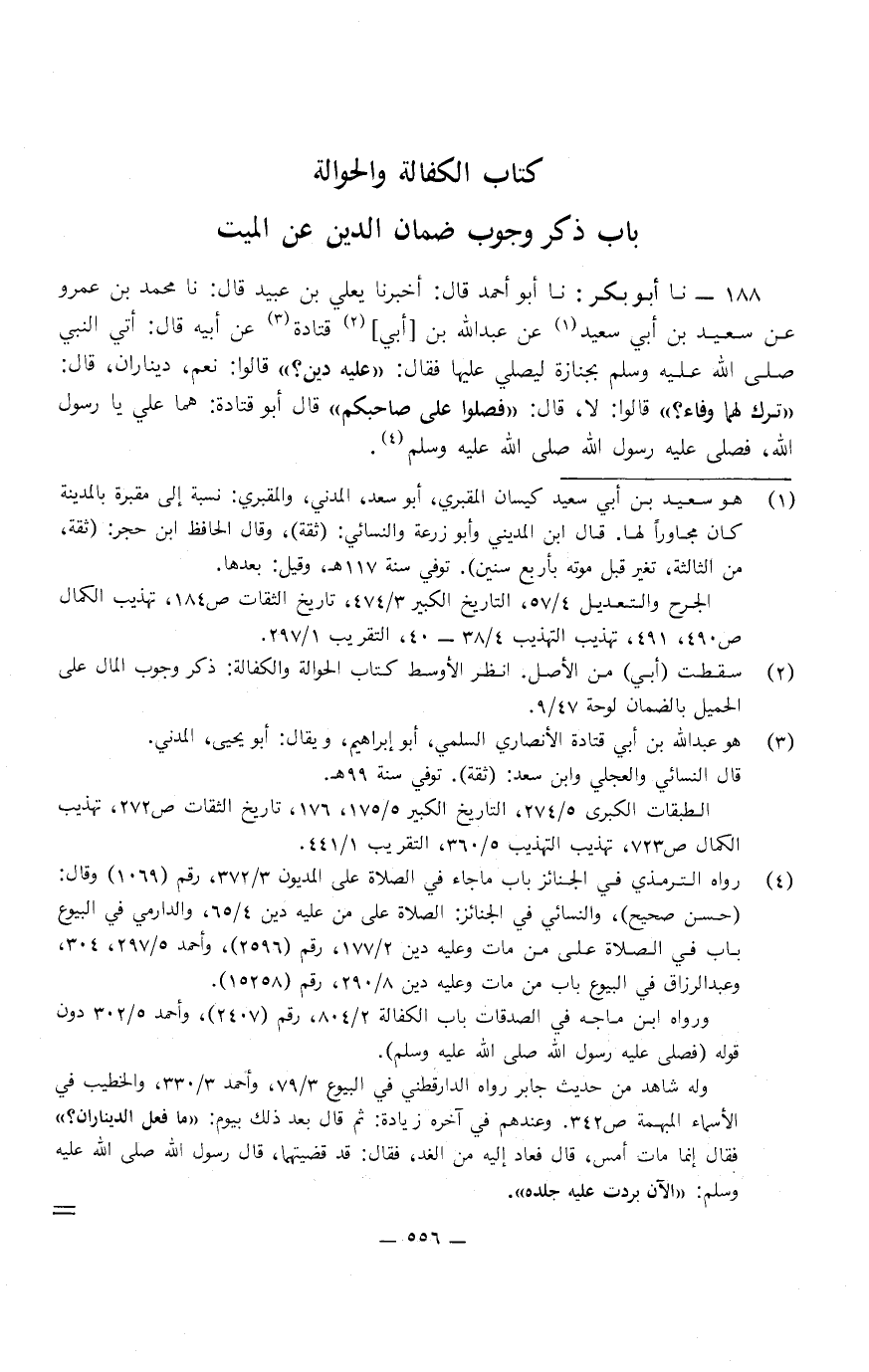 188 - نا أَبُو أَحْمَدَ، قَالَ: أَخْبَرَنَا يَعْلَى بْنُ عُبَيْدٍ، قَالَ: نا مُحَمَّدُ بْنُ عَمْرٍو، عَنْ سَعِيدِ بْنِ أَبِي سَعِيدٍ، عَنْ عَبْدِ اللَّهِ بْنِ أَبِي قَتَادَةَ، عَنْ أَبِيهِ، قَالَ: أُتِيَ النَّبِيُّ صَلَّى اللَّهُ عَلَيْهِ وَسَلَّمَ بِجِنَازَةٍ لِيُصَلَّى عَلَيْهَا، فَقَالَ: «عَلَيْهِ دَيْنٌ؟» قَالُوا: نَعَمْ، دِينَارَانِ.