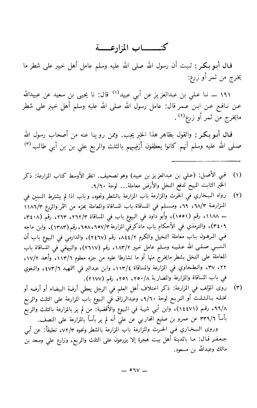 191 - نا علي بن عبد العزيز بن عبيد، قَالَ: «عامل رَسُول اللَّهِ صَلَّى اللَّهُ عَلَيْهِ وَسَلَّمَ أهل خيبر عَلَى شطر مَا يخرج من ثمر أو زرع» .