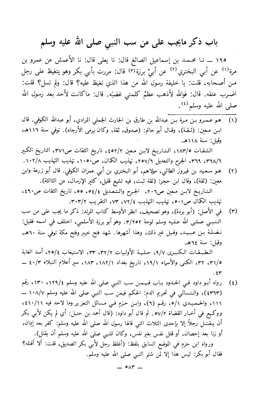 195 - نا مُحَمَّدُ بْنُ إِسْمَاعِيلَ الصَّائِغُ، قَالَ: نا يَعْلَى، قَالَ: نا الأَعْمَشُ، عَنْ عَمْرِو بْنِ مُرَّةَ، عَنْ أَبِي الْبَخْتَرِيِّ، عَنْ أَبِي بُرْدَةَ، قَالَ: " مَرَرْتُ بِأَبِي بَكْرٍ وَهُوَ يَتَغَيَّظُ عَلَى رَجُلٍ مِنْ أَصْحَابِهِ، قُلْتُ: يَا خَلِيفَةَ رَسُولِ اللَّهِ، مَنْ هَذَا الَّذِي تَتَغَيَّظُ عَلَيْهِ؟ ، قَالَ: وَلِمَ تَسْأَلُ؟ ، قُلْتُ: أَضْرِبُ عُنُقَهُ.