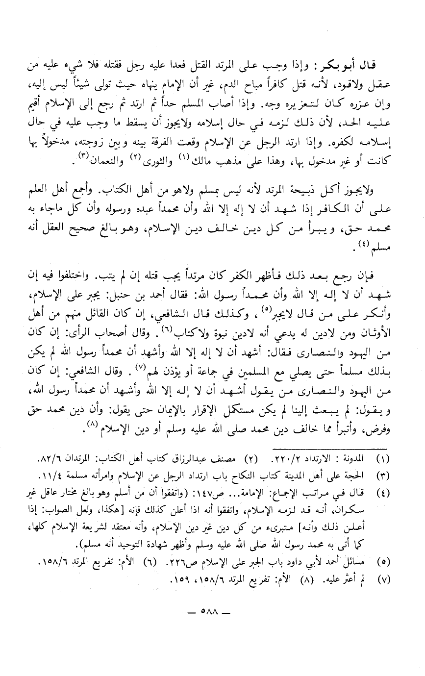 وأجمع أهل العلم: عَلَى أن الكافر إذا شهد أن لا إله إلا اللَّه وأن محمدا عبده ورسوله وأن كل مَا جَاءَ به مُحَمَّد حق ويبرأ من كل دين خالف دين الإسلام وهو بالغ صحيح العقل أنه مسلم، فإن رجع بعد ذَلِكَ فأظهر الكفر كَانَ مرتدا يجب قتله إذا لم يتب.