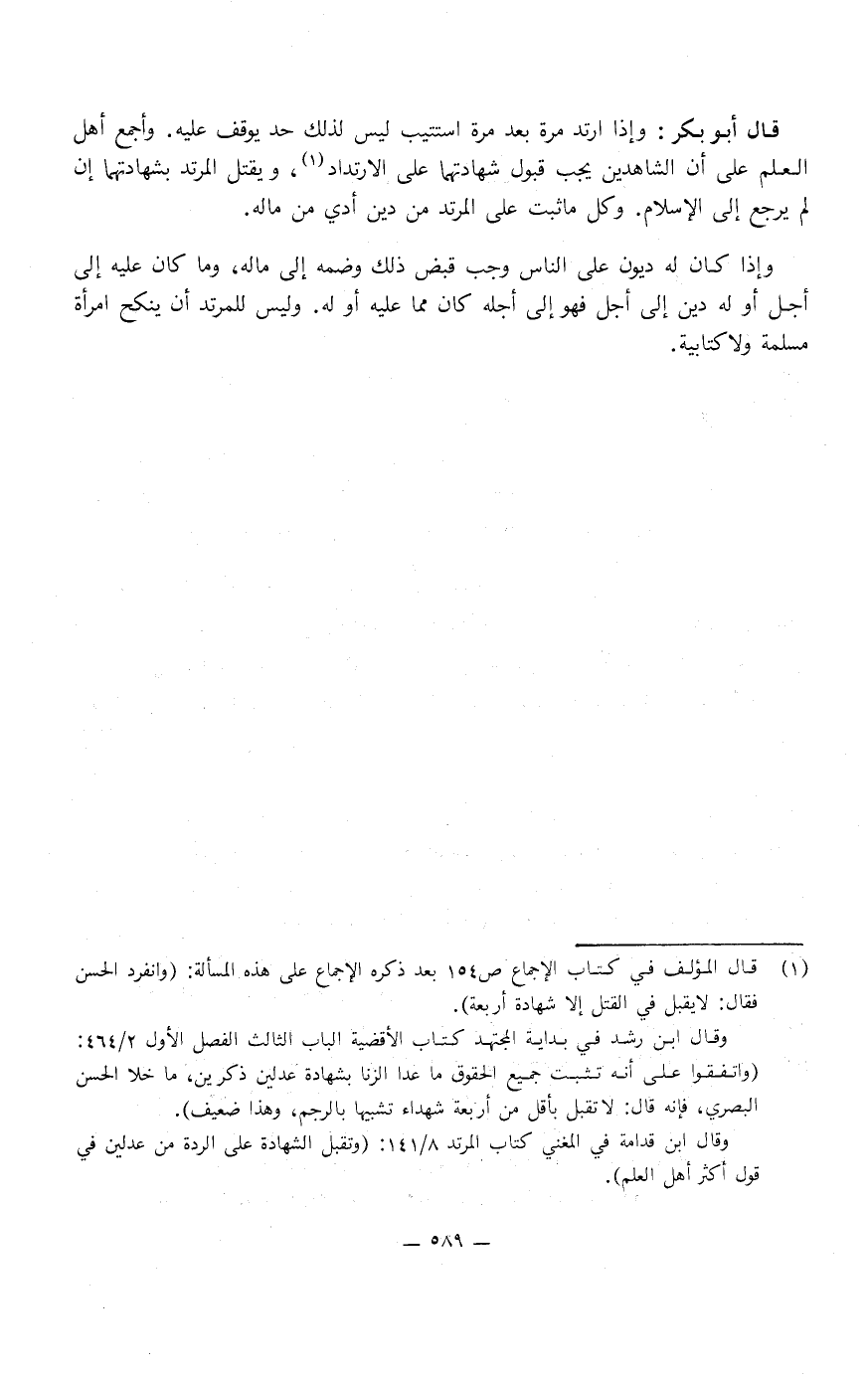 وأجمع أهل العلم: عَلَى أن الشاهدين يجب قبول شهادتهما عَلَى الارتداد، ويقتل المرتد بشهادتهما إن لم يرجع إِلَى الإسلام، وكل مَا ثبت عَلَى المرتد من دين أدي من ماله، وإذا كَانَ لَهُ ديون عَلَى الناس وجب قبض ذَلِكَ وضمه إِلَى ماله، وما كَانَ عليه إِلَى أجل أو لَهُ دين إِلَى أجل فهو إِلَى أجله كَانَ مما عليه أو لَهُ، وليس للمرتد أن ينكح امرأة مسلمة وَلا كتابية.