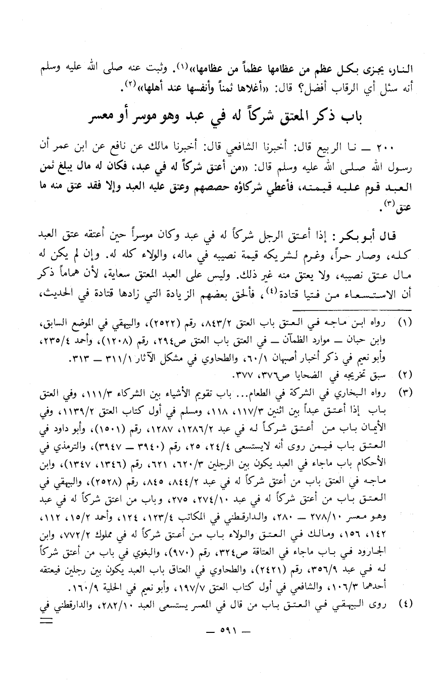 200 - نا الرَّبِيعُ، قَالَ: أَخْبَرَنَا الشَّافِعِيُّ، قَالَ: أَخْبَرَنَا مَالِكٌ، عَنْ نَافِعٍ، عَنِ ابْنِ عُمَرَ، أَنَّ رَسُولَ اللَّهِ صَلَّى اللَّهُ عَلَيْهِ وَسَلَّمَ، قَالَ: «مَنْ أَعْتَقَ شِرْكًا لَهُ فِي عَبْدٍ، فَكَانَ لَهُ مَالٌ يَبْلُغُ ثَمَنَ الْعَبْدِ قُوِّمَ عَلَيْهِ قِيمَتَهُ فَأُعْطِيَ شُرَكَاؤُهُ حِصَصَهُمْ وَعَتَقَ عَلَيْهِ الْعَبْدُ، وَإِلا فَقَدْ عَتَقَ مِنْهُ مَا عَتَقَ»