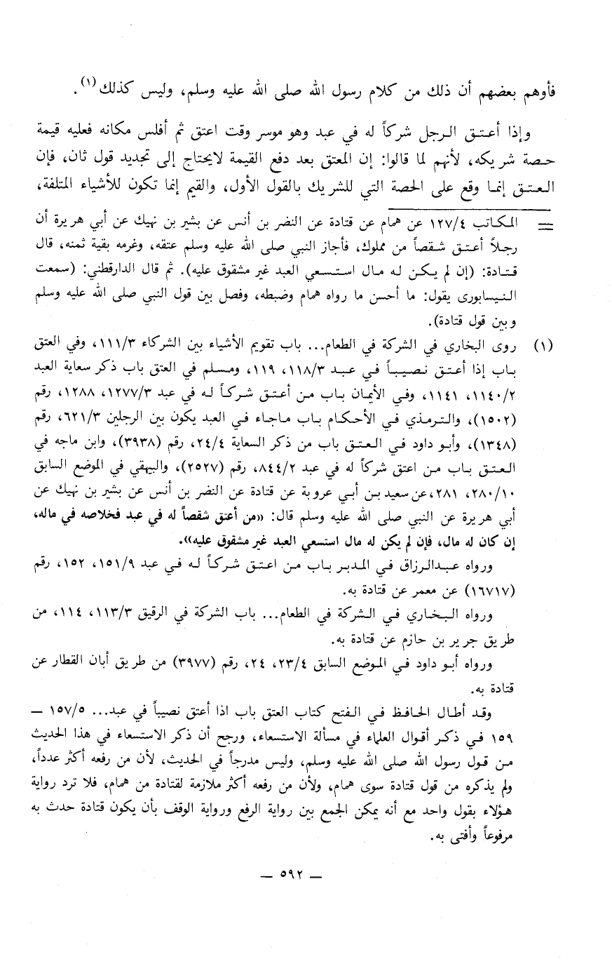 فأوهم بعضهم أن ذَلِكَ من كلام رَسُول اللَّهِ صَلَّى اللَّهُ عَلَيْهِ وَسَلَّمَ، وليس كذلك وإذا أعتق الرجل شركا لَهُ فِي عبد وهو موسر وقت أعتق، ثم أفلس مكانه فعليه قيمة حصة شريكه، لأنهم لما قالوا: إن المعتق بعد دفع القيمة لا يحتاج إِلَى تجديد قول ثان، فإن العتق إنما وقع عَلَى الحصة التي للشريك بالقول الأول، والقيم إنما تكون للأشياء المتلفة،