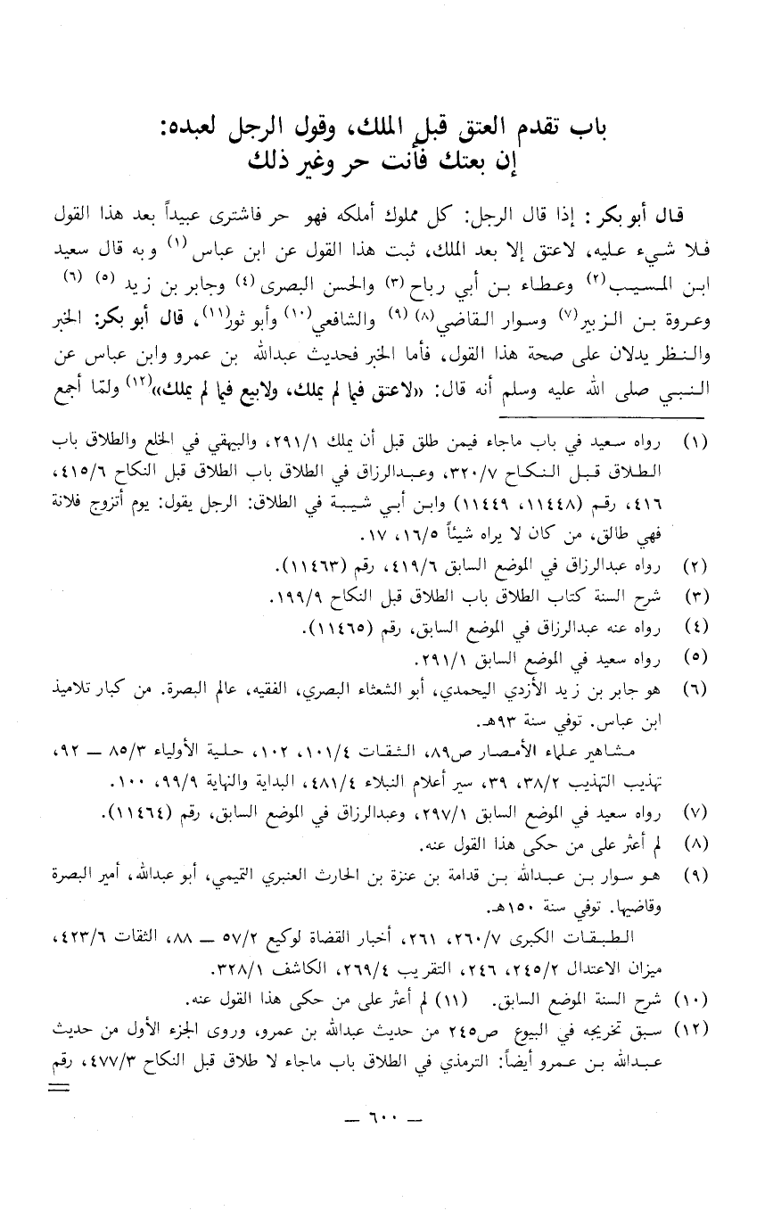 إذا قَالَ الرجل: كل مملوك أملكه فهو حر فاشترى عبيدا بعد هذا القول فلا شيء عليه، لا عتق إلا بعد الملك، ثبت هذا القول عن ابن عباس، وبه قَالَ: سعيد بن المسيب، وعطاء بن أبي رباح، والحسن البصري، وجابر بن زيد، وعروة بن الزبير، وسوار القاضي، والشافعي، وأبو ثور.