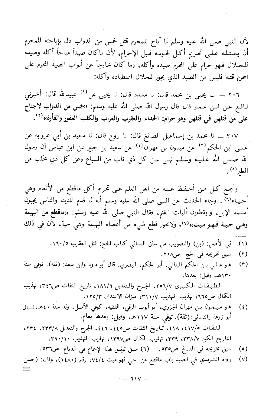 206 - نا يَحْيَى بْنُ مُحَمَّدٍ، قَالَ: نا مُسَدَّدٌ، قَالَ: نا يَحْيَى عَنْ عُبَيْدِ اللَّهِ، قَالَ: أَخْبَرَنِي نَافِعٌ، عَنِ ابْنِ عُمَرَ، قَالَ: قَالَ رَسُولُ اللَّهِ صَلَّى اللَّهُ عَلَيْهِ وَسَلَّمَ: " خَمْسٌ مِنَ الدَّوَابِّ لا جُنَاحَ عَلَى مَنْ قَتَلَهُنَّ فِي قَتْلِهِنَّ وَهُوَ حَرَامٌ: الْحِدَأَةُ، وَالْعَقْرَبُ، وَالْغُرَابُ، وَالْكَلْبُ الْعَقُورُ، وَالْفَأْرَةُ "