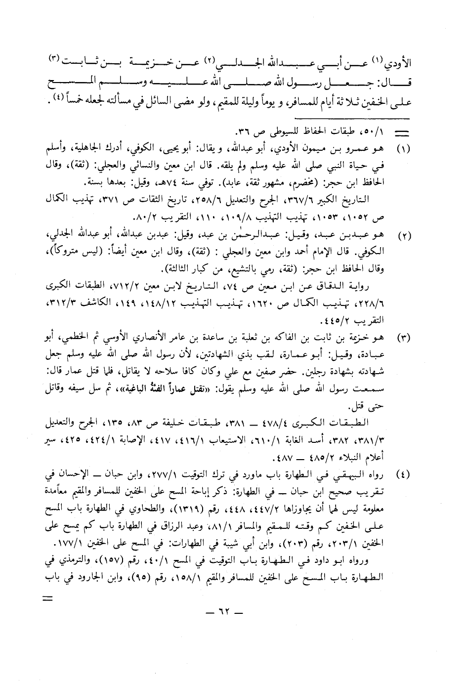 الأَوْدِيِّ، عَنْ أَبِي عَبْدِ اللَّهِ الْجَدَلِيِّ، عَنْ خُزَيْمَةَ بْنِ ثَابِتٍ، قَالَ: «جَعَلَ رَسُولُ اللَّهِ صَلَّى اللَّهُ عَلَيْهِ وَسَلَّمَ الْمَسْحَ عَلَى الْخُفَّيْنِ ثَلاثَةَ أَيَّامٍ وَلَيَالِيهِنَّ لِلْمُسَافِرِ، وَيَوْمًا وَلَيْلَةً لِلْمُقِيمِ» ، وَلَوْ مَضَى السَّائِلُ فِي مَسْأَلَتِهِ لَجَعَلَهُ خَمْسًا