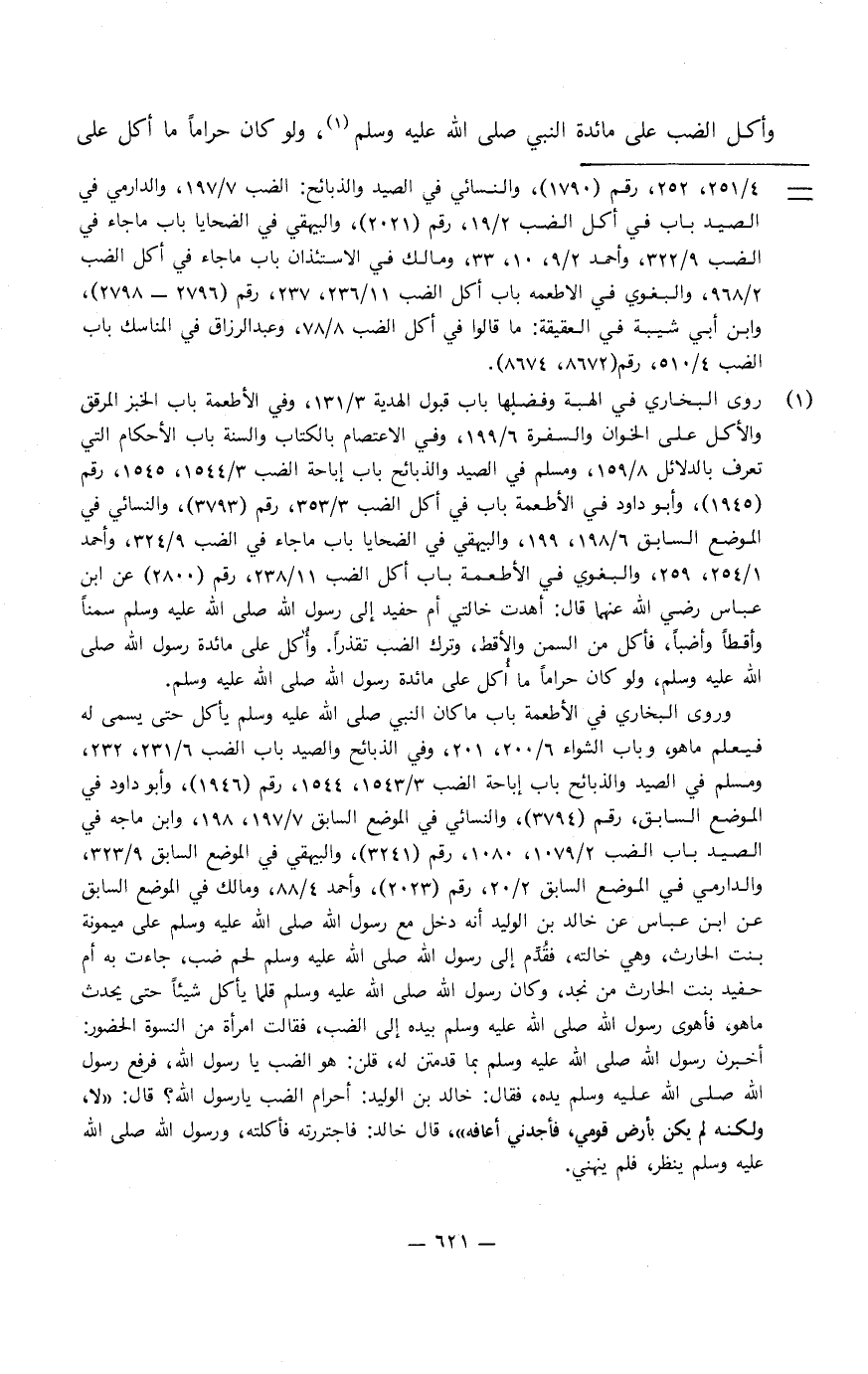 وَأُكِلَ الضَّبُّ عَلَى مَائِدَةِ النَّبِيِّ صَلَّى اللَّهُ عَلَيْهِ وَسَلَّمَ وَلَوْ كَانَ حَرَامًا مَا أُكِلَ عَلَى