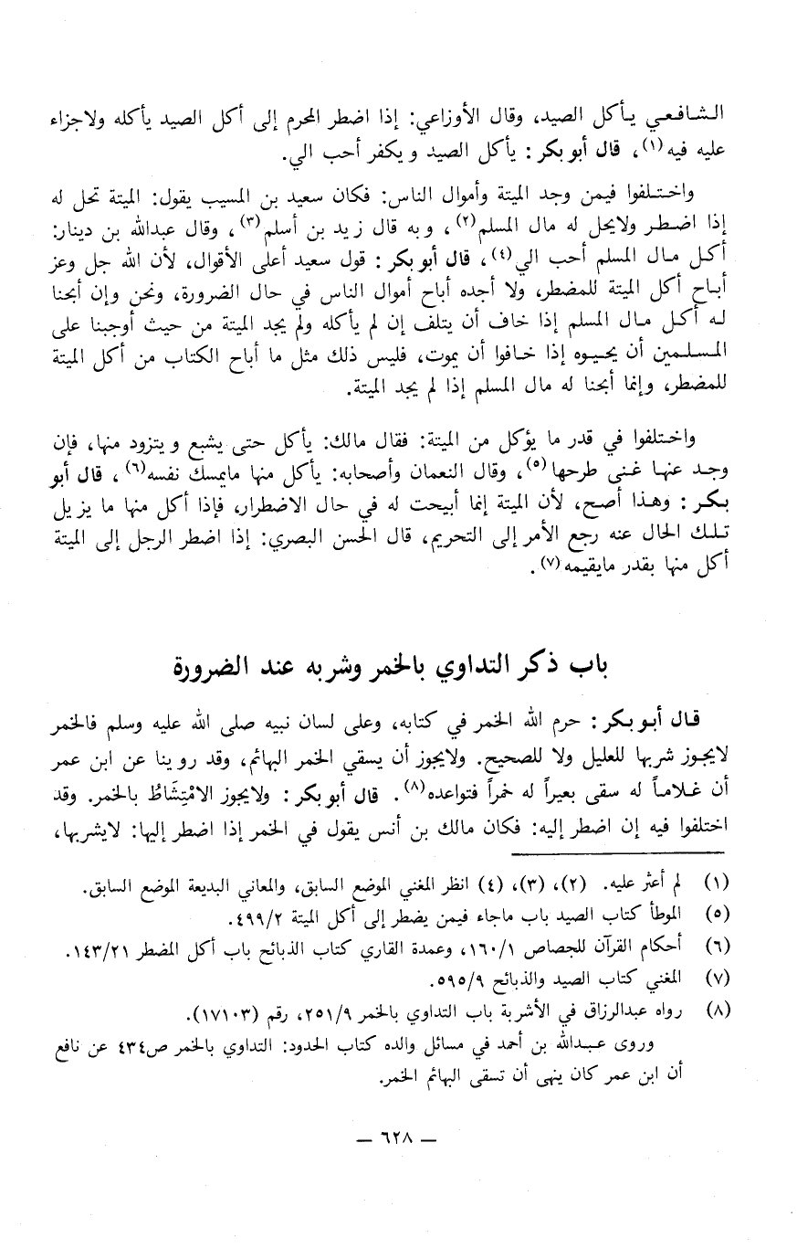 يأكل الصيد، ويكفر أحب إلي، واختلفوا فيمن وجد الميتة وأموال الناس، فكان سعيد بن المسيب، يقول: الميتة تحل لَهُ إذا اضطر، وَلا يحل لَهُ مال المسلم، وبه قَالَ: زيد بن أسلم، وقال عبد الله بن دينار: أكل مال المسلم أحب إلي.