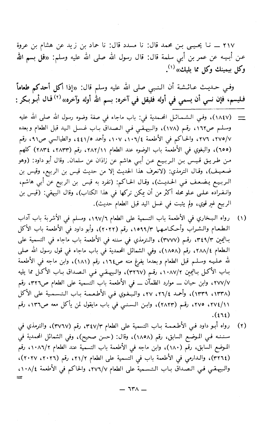 217 - نا يَحْيَى بْنُ مُحَمَّدٍ، قَالَ: نا مُسَدَّدٌ، قَالَ: نا حَمَّادُ بْنُ زَيْدٍ، عَنْ هِشَامِ بْنِ عُرْوَةَ، عَنْ أَبِيهِ، عَنْ عُمَرَ بْنِ أَبِي سَلَمَةَ، قَالَ: قَالَ رَسُولُ اللَّهِ صَلَّى اللَّهُ عَلَيْهِ وَسَلَّمَ: «قُلْ بِسْمِ اللَّه وَكُلْ بِيَمِينِكَ وَكُلْ مِمَّا يَلِيكَ» .
