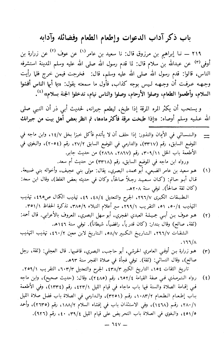 219 - نا إِبْرَاهِيمُ بْنُ مَرْزُوقٍ، قَالَ: نا سَعِيدُ بْنُ عَامِرٍ، عَنْ عَوْفٍ، عَنْ زُرَارَةَ بْنِ أَوْفَى، عَنْ عَبْدِ اللَّهِ بْنِ سَلامٍ، قَالَ: لَمَّا قَدِمَ رَسُولُ اللَّهِ صَلَّى اللَّهُ عَلَيْهِ وَسَلَّمَ الْمَدِينَةَ اسْتَشْرَفَهُ النَّاسُ، قَالُوا: قَدِمَ رَسُولُ اللَّهِ صَلَّى اللَّهُ عَلَيْهِ وَسَلَّمَ، قَالَ: فَخَرَجْتُ فِيمَنْ خَرَجَ، فَلَمَّا رَأَيْتُ وَجْهَهُ عَرَفْتُ أَنَّ وَجْهَهُ لَيْسَ بِوَجْهِ كَذَّابٍ، فَأَوَّلُ مَا سَمِعْتُهُ، يَقُولُ: «يَأَيُّهَا النَّاسُ، أَفْشُوا السَّلامَ، وَأَطْعِمُوا الطَّعَامَ، وَصِلُوا الأَرْحَامَ، وَصَلُّوا وَالنَّاسُ نِيَامٌ تَدْخُلُوا الْجَنَّةَ بِسَلامٍ» .