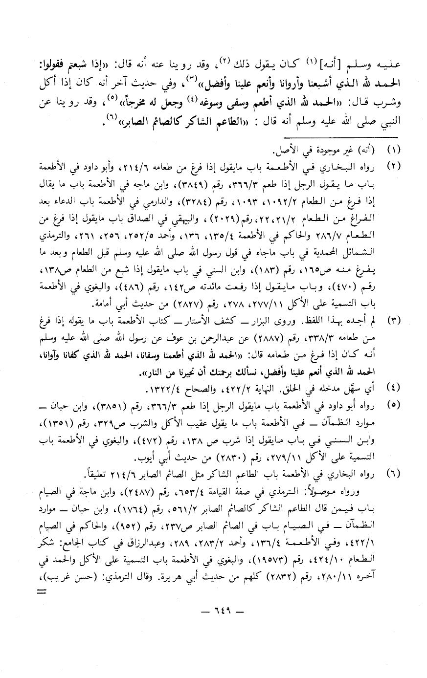 عَلَيْهِ وَسَلَّمَ كَانَ يفعل ذَلِكَ، وقد روينا عَنْهُ، أنه قَالَ: " إذا شبعتم فقولوا: الحمد لله الذي أشبعنا وأروانا وأنعم علينا وأفضل ".