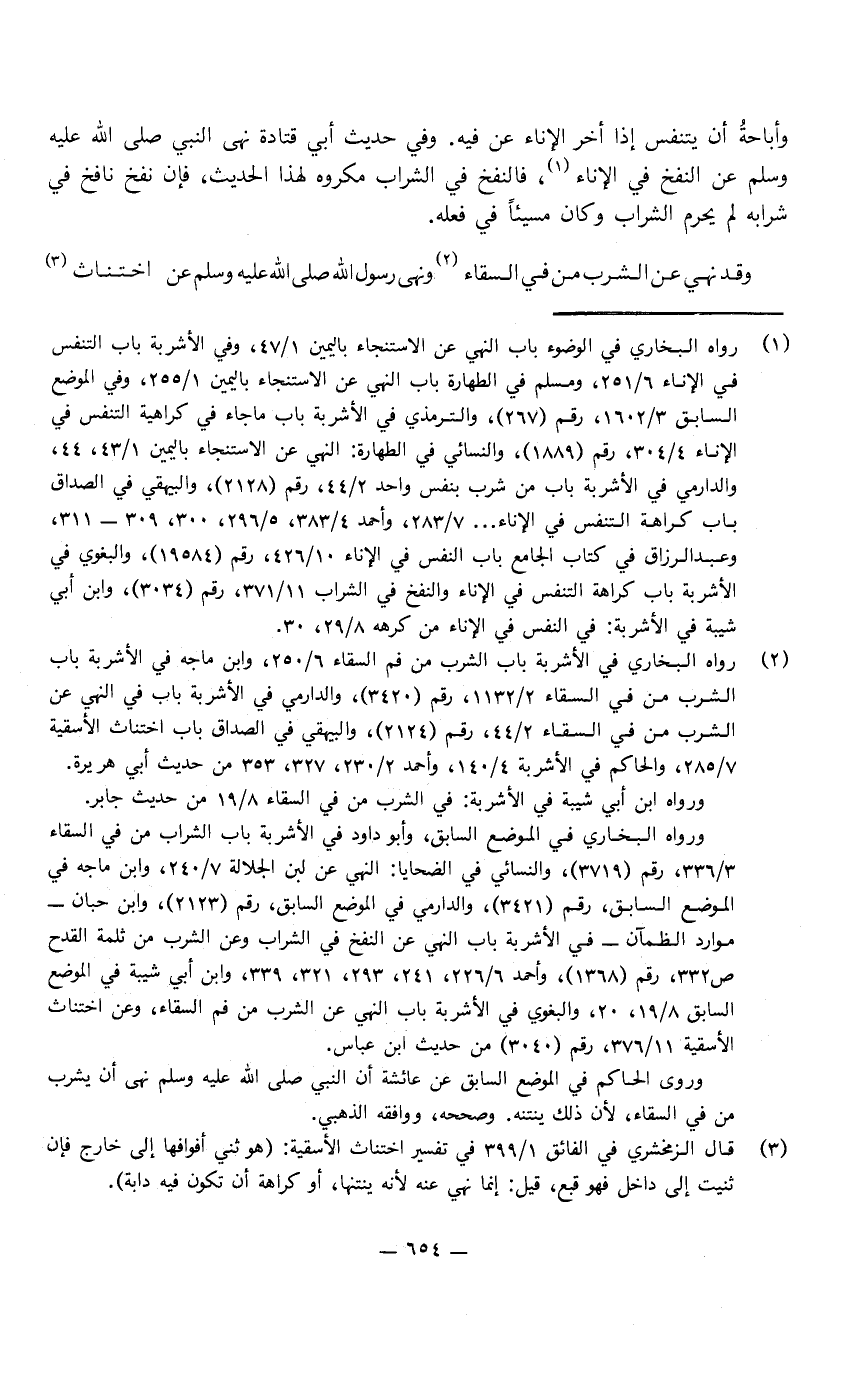 وإباحة أن يتنفس إذا أخر الإناء عن فِيهِ، وفي حديث أبي قتادة: «نهى النَّبِيّ صَلَّى اللَّهُ عَلَيْهِ وَسَلَّمَ عن النفخ فِي الإناء» ، فالنفخ فِي الشراب مكروه بهذا الحديث، فإن نفخ نافخ فِي شرابه لم يحرم الشراب، وكان مسيئا فِي فعله، وقد نهى عن الشرب من فِي السقاء.