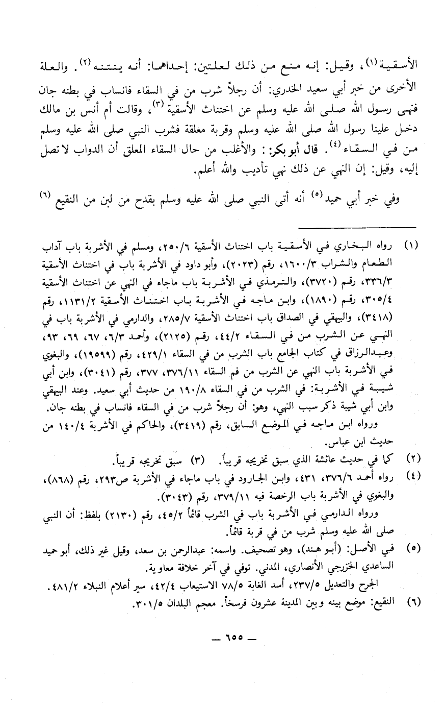 والعلة الأخرى: خبر أبي سعيد الخدري: «أن رجلا شرب من فِي السقاء فانساب فِي بطنه جان، فنهى رَسُول اللَّهِ صَلَّى اللَّهُ عَلَيْهِ وَسَلَّمَ عن اختناث الأسقية» ، وقالت أم أنس بن مالك: «دخل علينا رَسُول اللَّهِ صَلَّى اللَّهُ عَلَيْهِ وَسَلَّمَ وقربة معلقة فشرب النَّبِيّ صَلَّى اللَّهُ عَلَيْهِ وَسَلَّمَ من فِي السقاء» .