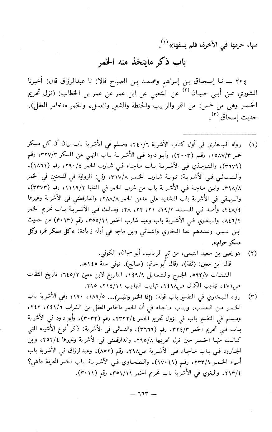 224 - نا إِسْحَاقُ بْنُ إِبْرَاهِيمَ، وَمُحَمَّدُ بْنُ الصَّبَّاحِ، قَالا: نا عَبْدُ الرَّزَّاقِ، قَالَ: أَخْبَرَنَا الثَّوْرِيُّ، عَنْ أَبِي حِبَّانَ، عَنِ الشَّعْبِيِّ، عَنِ ابْنِ عُمَرَ، عَنْ عُمَرَ بْنِ الْخَطَّابِ، " نَزَلَ تَحْرِيمُ الْخَمْرِ وَهِيَ مِنْ خَمْسٍ: التَّمْرِ، وَالزَّبِيبِ، وَالْحِنْطَةِ، وَالشَّعِيرِ، وَالْعَسَلِ، وَالْخَمْرُ مَا خَامَرَ الْعَقْلَ "، حَدِيثُ إِسْحَاقَ.