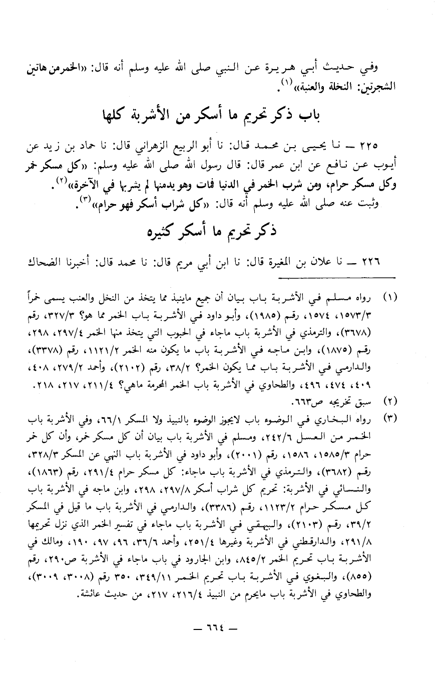 225 - نا يَحْيَى بْنُ مُحَمَّدٍ، قَالَ: نا أَبُو الرَّبِيعِ الزَّهْرَانِيُّ، قَالَ: نا حَمَّادُ بْنُ زَيْدٍ، عَنْ أَيُّوبَ، عَنْ نَافِعٍ، عَنِ ابْنِ عُمَرَ، قَالَ: قَالَ رَسُولُ اللَّهِ صَلَّى اللَّهُ عَلَيْهِ وَسَلَّمَ: «كُلُّ مُسْكِرٍ خَمْرٌ، وَكُلُّ مُسْكِرٍ حَرَامٌ، وَمَنْ شَرِبَ الْخَمْرَ فِي الدُّنْيَا فَمَاتَ وَهُوَ يُدْمِنُهَا لَمْ يَشْرَبْهَا فِي الآخِرَةِ» .