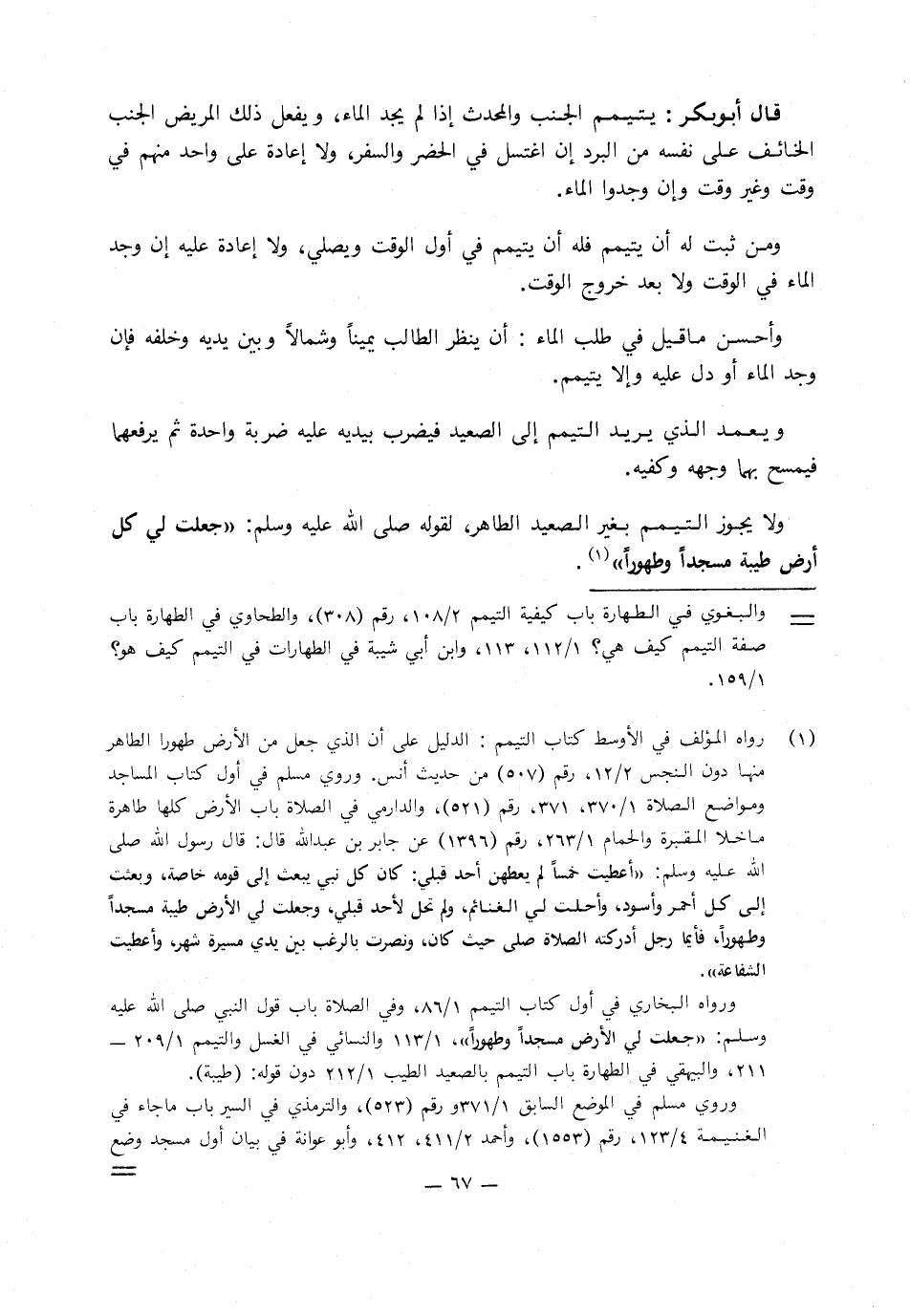 يتيمم الجنب والمحدث إذا لم يجد الْمَاء، ويفعل ذَلِكَ المريض الجنب الخائف عَلَى نفسه من البرد إن اغتسل في الحضر والسفر، وَلا إعادة عَلَى واحد منهم في وقت وغير وقت، وإن وجدوا الْمَاء، ومن ثبت لَهُ أن يتيمم فله أن يتيمم في أول الوقت، ويصلي وَلا إعادة عليه إن وجد الْمَاء في الوقت، وَلا بعد خروج الوقت.