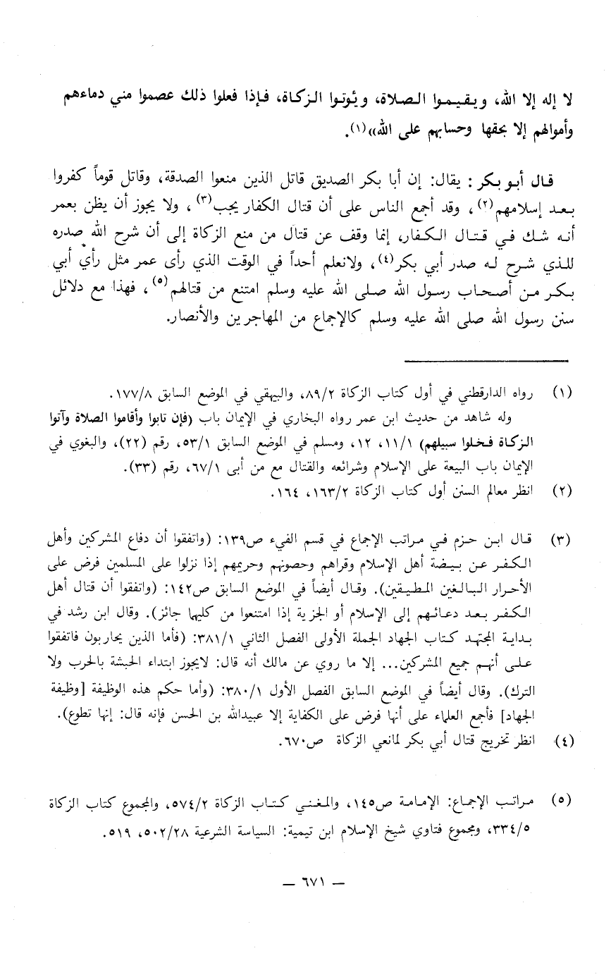يقال: إن أبا بكر الصديق قاتل الذين منعوا الصدقة، وقاتل قوما كفروا بعد إسلامهم، وقد أجمع الناس عَلَى أن قتال الكفار يجب، وَلا يجوز أن يظن بعمر أنه شك فِي قتال الكفار، إنما وقف عن قتال من منع الزكاة إِلَى أن شرح اللَّه صدره للذي شرح لَهُ صدر أبي بكر، وَلا نعلم أحدا فِي الوقت الذي رأى عمر مثل رأي أبي بكر من أصحاب رَسُول اللَّهِ صَلَّى اللَّهُ عَلَيْهِ وَسَلَّمَ، امتنع من قتالهم فهذا مع دلائل سنن رَسُول اللَّهِ صَلَّى اللَّهُ عَلَيْهِ وَسَلَّمَ، كالإجماع من المهاجرين والأنصار.