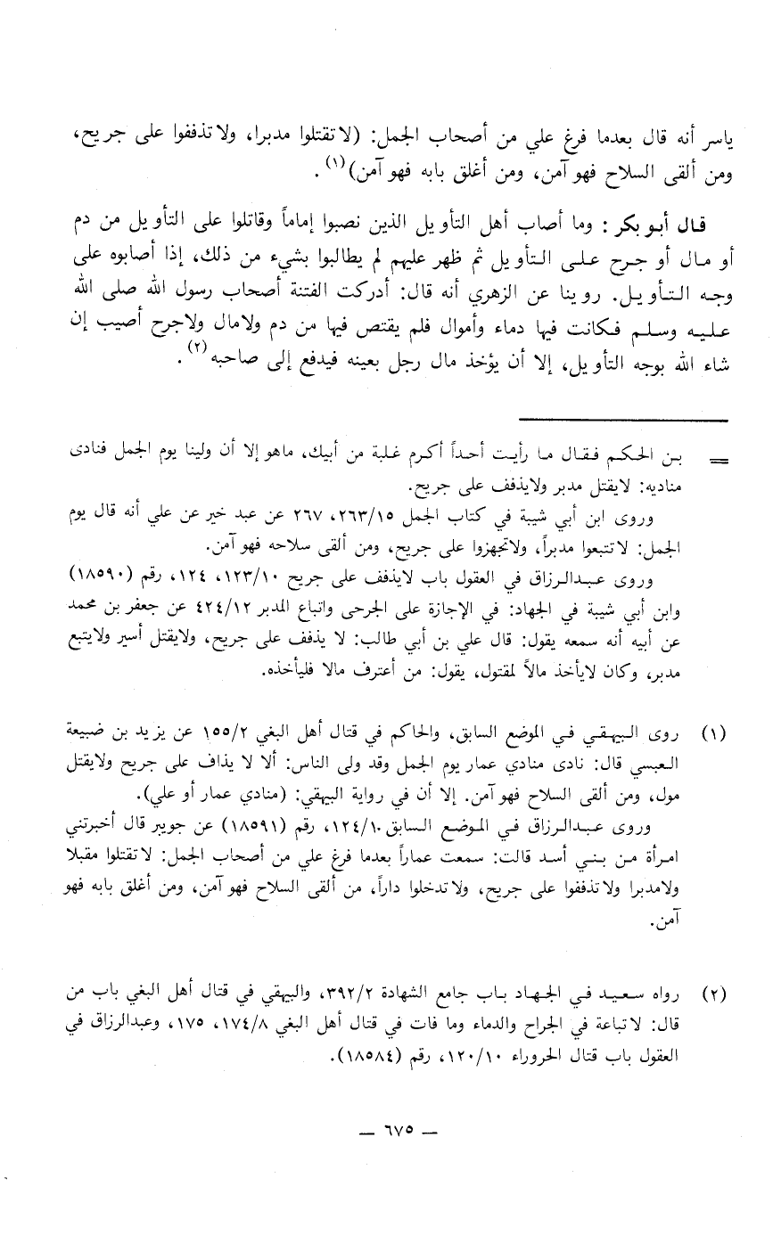 ياسر أنه قَالَ بعد مَا فرغ علي من أصحاب الجمل: «لا تقتلوا مدبرًا، وَلا تذففوا عَلَى جريح، ومن ألقى السلاح فهو آمن، ومن أغلق بابه فهو آمن» .