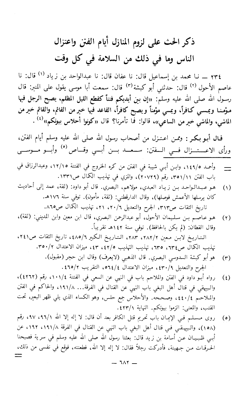 234 - نا مُحَمَّدُ بْنُ إِسْمَاعِيلَ، قَالَ: نا عَفَّانُ، قَالَ: نا عَبْدُ الْوَاحِدِ بْنُ زِيَادٍ، قَالَ: نا عَاصِمٌ الأَحْوَلُ، قَالَ: حَدَّثَنِي أَبُو كَبْشَةَ، قَالَ: سَمِعْتُ أَبَا مُوسَى يَقُولُ عَلَى الْمِنْبَرِ: قَالَ رَسُولُ اللَّهِ صَلَّى اللَّهُ عَلَيْهِ وَسَلَّمَ: «إِنَّ بَيْنَ أَيْدِيكُمْ فِتَنًا كَقِطَعِ اللَّيْلِ الْمُظْلِمِ يُصْبِحُ الرَّجُلُ فِيهَا مُؤْمِنًا، وَيُمْسِي كَافِرًا، وَيُمْسِي مُؤْمِنًا، وَيُصْبِحُ كَافِرًا، الْقَاعِدُ فِيهَا خَيْرٌ مِنَ الْقَائِمِ، وَالْقَائِمُ خَيْرٌ مِنَ الْمَاشِي، وَالْمَاشِي خَيْرٌ مِنَ السَّاعِي» .