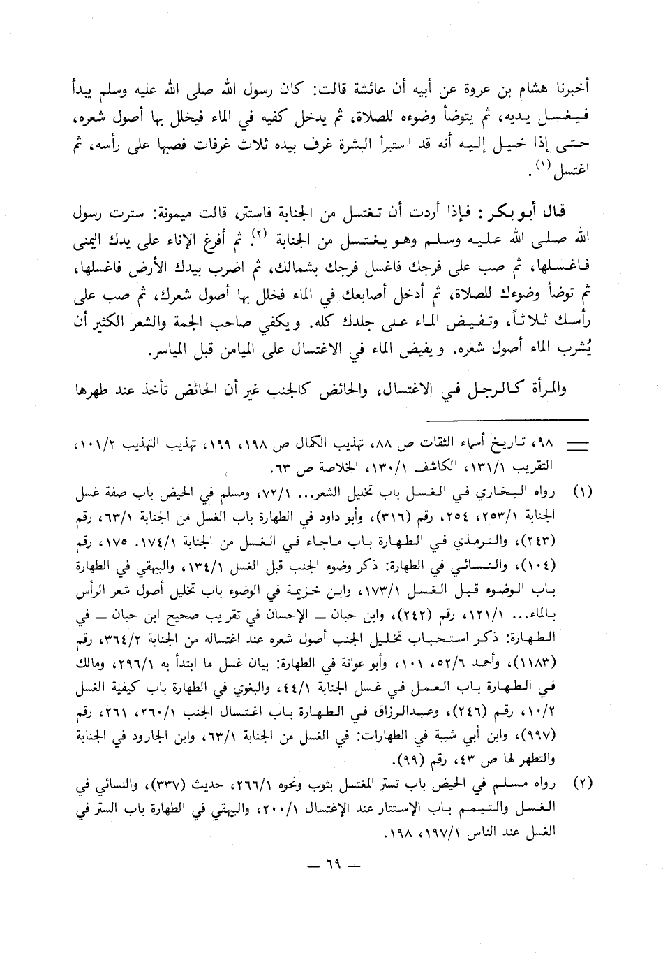 ويكفي صاحب الجمة والشعر الكثير أن يتسرب الْمَاء أصول شعره، ويفيض الْمَاء في الاغتسال عَلَى الميامن قبل المياسر.