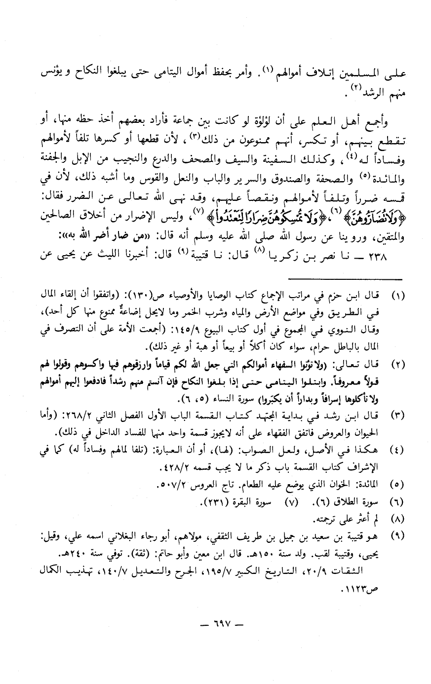 عَلَى الْمُسْلِمِينَ إِتْلافَ أَمْوَالِهِمْ، وَأَمَرَ بِحِفْظِ أَمْوَالِ الْيَتَامَى حَتَّى يَبْلُغُوا النِّكَاحَ، وَيُؤْنَسَ مِنْهُمُ الرُّشْدُ