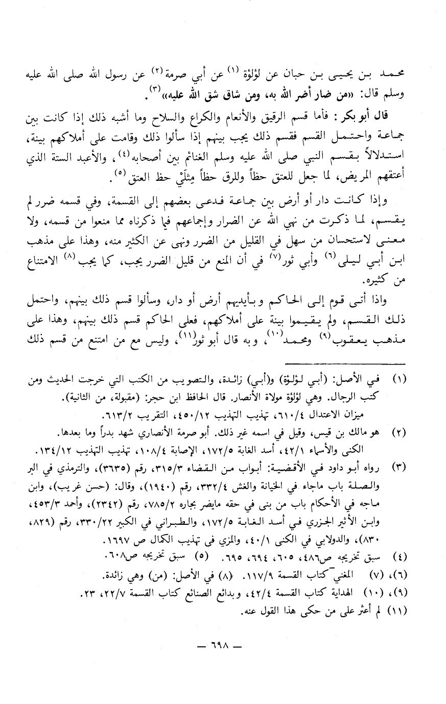 وإذا كانت دار أو أرض بين جماعة فدعا بعضهم إِلَى القسم وفي قسمه ضرر لم يقسم، لما ذكرت من نهي اللَّه عن الضرار، وإجماعهم فيما ذكرناه مما منعوا من قسمه، وَلا معنى لاستحسان من سهل فِي القليل من الضرر، ونهى عن الكثير منه، وهذا عَلَى مذهب ابن أبي ليلى، وأبي ثور فِي أن المنع من قليل الضرر يجب الامتناع من كثيره.