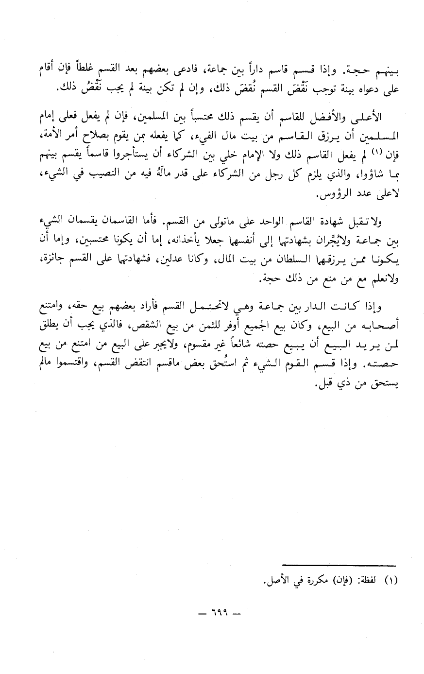 وإذا قسم قاسم دارا بين جماعة فادعى بعضهم بعد القسم غلطا، فإن أقام عَلَى دعواه بينة، توجب نقض القسم، نقض ذَلِكَ، وإن لم تكن بينة لم يجب نقض ذَلِكَ الأعلى، والأفضل للقاسم أن يقسم ذَلِكَ محتسبا بين المسلمين، فإن لم يفعل فعلى إمام المسلمين أن يرزق القاسم من بيت مال الفيء كما يفعله بمن يقوم بصلاح أمر الأمة، فإن لم يفعل القاسم ذَلِكَ، وَلا الإمام خلي بين الشركاء أن يستأجروا قاسما يقسم بينهم بما شاءوا، والذي يلزم كل رجل من الشركاء عَلَى قدر ماله فِيهِ من النصيب فِي الشيء لا عَلَى عدد الرءوس، وَلا تقبل شهادة القاسم الواحد عَلَى مَا تولى من القسم.