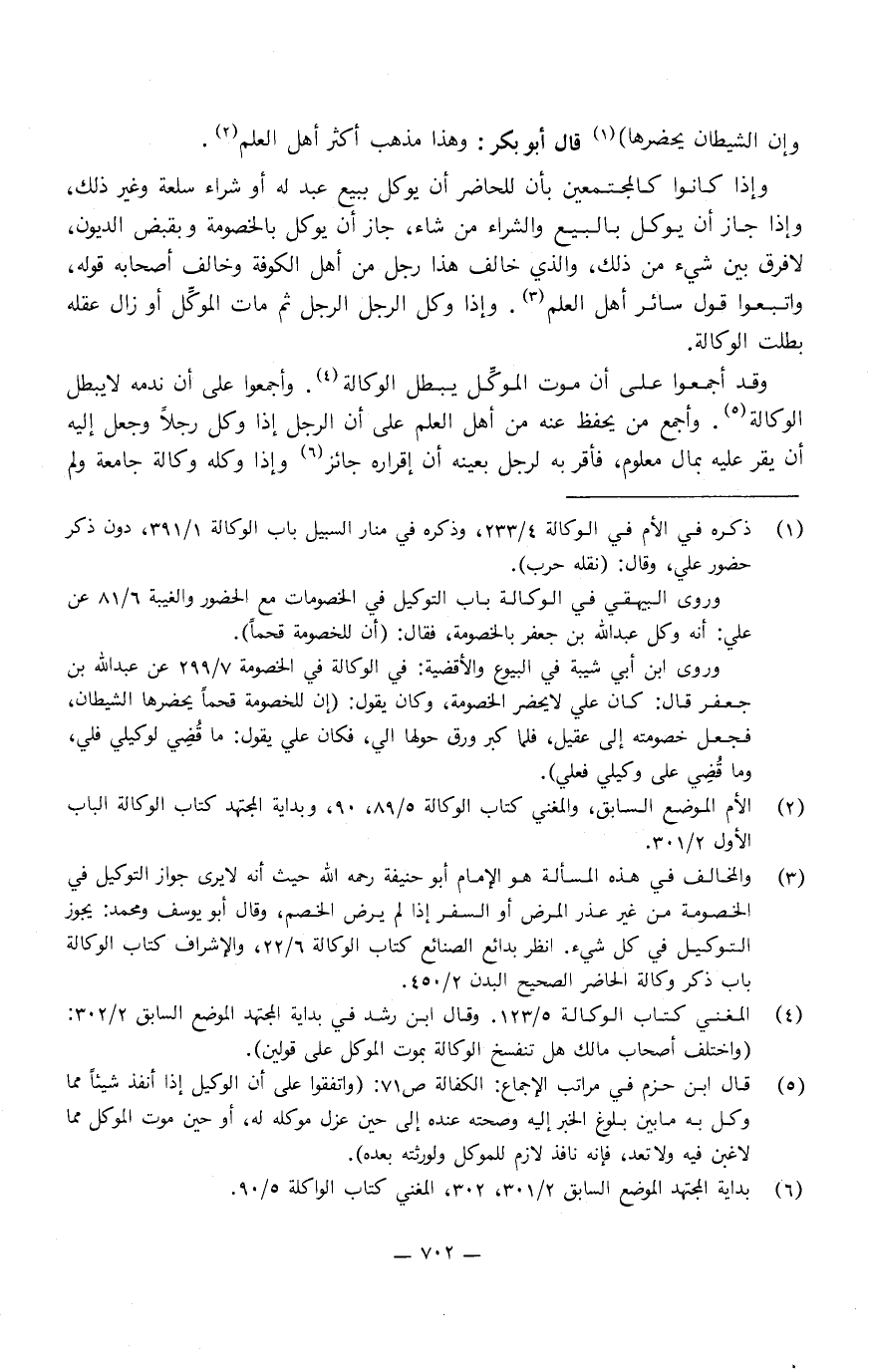وإذا كانوا كالمجمعين، فإن للحاضر أن يوكل ببيع عبد لَهُ أو شراء سلعة وغير ذَلِكَ، وإذا جاز أن يوكل بالبيع والشراء من شاء جاز أن يوكل بالخصومة وبقبض الديون، لا فرق بين شيء من ذَلِكَ، والذي خالف هذا رجل من أهل الكوفة، وخالف أصحابه قوله واتبعوا قول سائر أهل العلم.