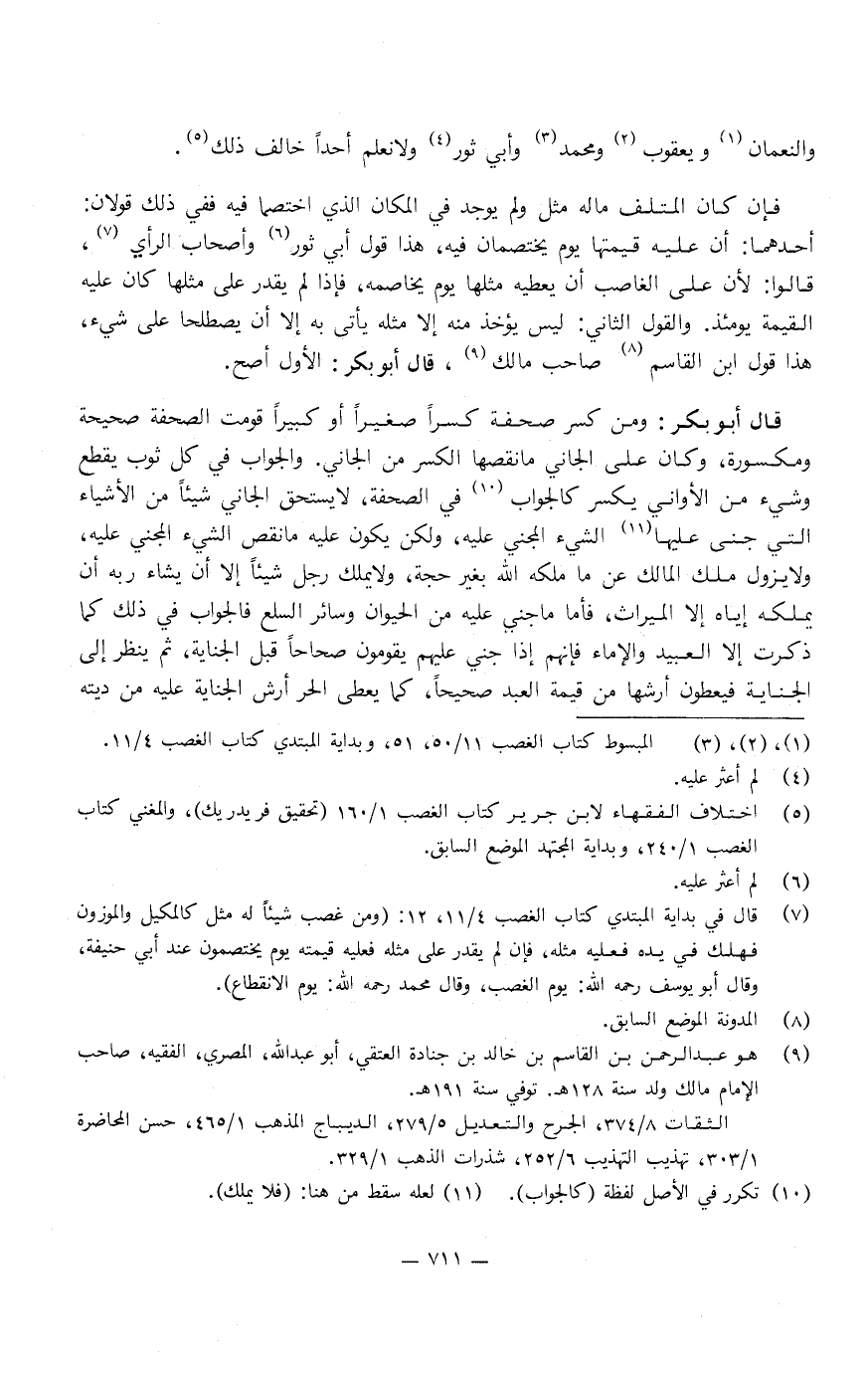 والنعمان، ويعقوب، ومحمد، وأبي ثور، وَلا نعلم أحدًا خالف ذَلِكَ، فإن كَانَ المتلف مَا لَهُ مثل، ولم يوجد فِي المكان الذي اختصما فِيهِ ففي ذَلِكَ قولان، أحدهما: أن عليه قيمتها يوم يختصمان فِيهِ هذا قول أبي ثور، وأصحاب الرأي، قالوا: لأن الغاصب أن يعطيه مثلها يوم يخاصمه، فإذا لم يقدر عَلَى مثلها كَانَ عليه القيمة يومئذ.