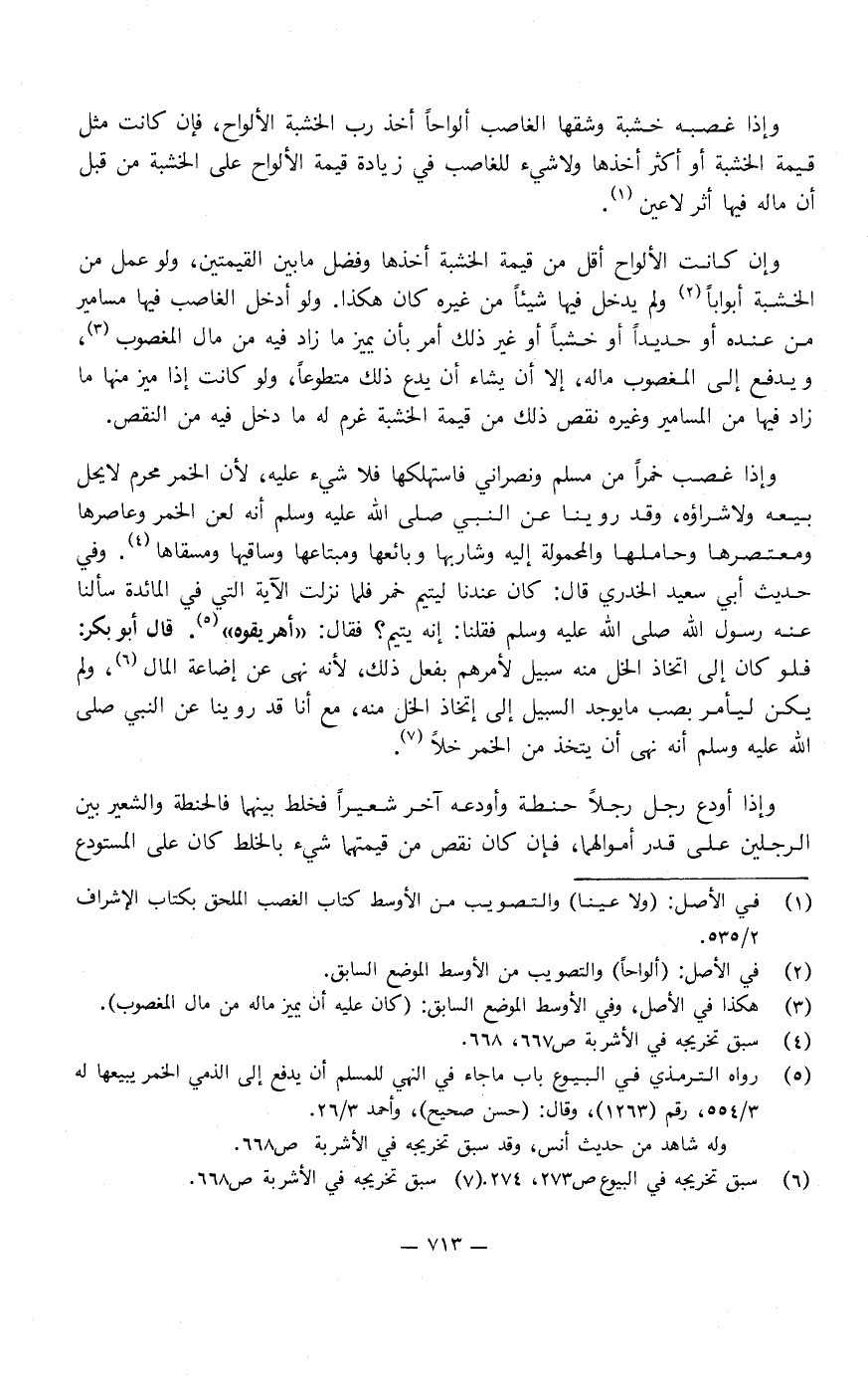 وإذا غصب خمرًا من مسلم ونصراني فاستهلكها فلا شيء عليه، لأن الخمر محرم لا يحل بيعه وَلا شراؤه، وقد روينا عَنِ النَّبِيِّ صَلَّى اللَّهُ عَلَيْهِ وَسَلَّمَ: أنه «لعن الخمر، وعاصرها، ومعتصرها، وحاملها، والمحمولة إليه، وشاربها، وبائعها، ومبتاعها، وساقيها، ومسقاها» ، وفي حديث أبي سعيد الخدري، قَالَ: كَانَ عندنا ليتيم خمر، فلما نزلت الآية التي فِي المائدة سألنا عَنْهُ رَسُول اللَّهِ صَلَّى اللَّهُ عَلَيْهِ وَسَلَّمَ، فقلنا لَهُ: إنه يتيم.