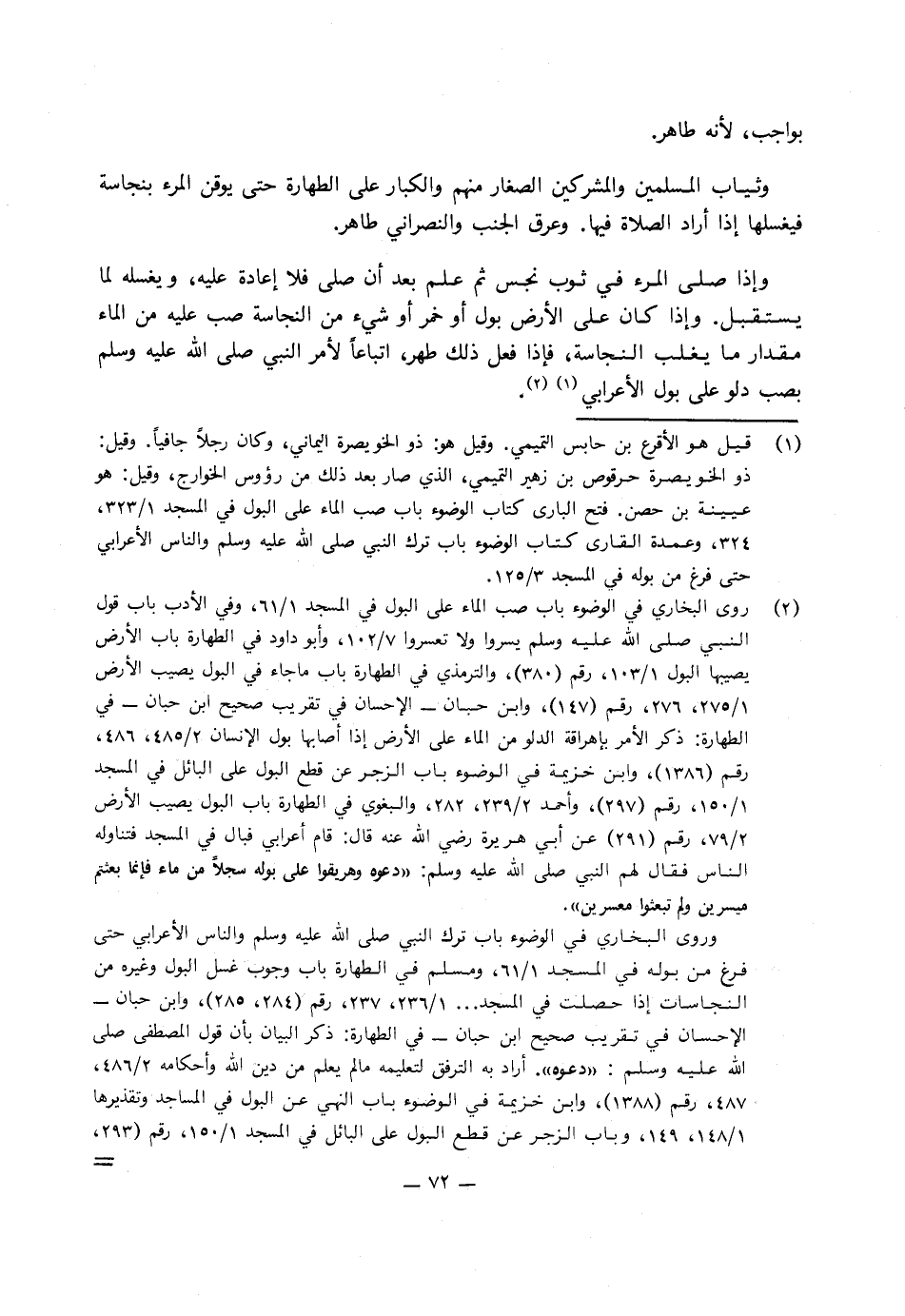 بواجب، لأنه طاهر وثياب المسلمين والمشركين الصغار منهم والكبار عَلَى الطهارة، حَتَّى يوقن المرء بنجاسة فيغسلها إذا أراد الصلاة فيها، وعرق الجنب والنصراني طاهر، وإذا صلى المرء في ثوب نجس، ثم علم بعد أن صلى فلا إعادة عليه، ويغسله لما يستقبل، وإذا كَانَ عَلَى الأرض بول أو خمر أو شيء من النجاسة صب عليه من الْمَاء مقدار مَا يغلب النجاسة، فإذا فعل ذَلِكَ طهر اتباعًا لأمر النَّبِيّ صَلَّى اللَّهُ عَلَيْهِ وَسَلَّمَ بصب دلو عَلَى بول الأعرابي،