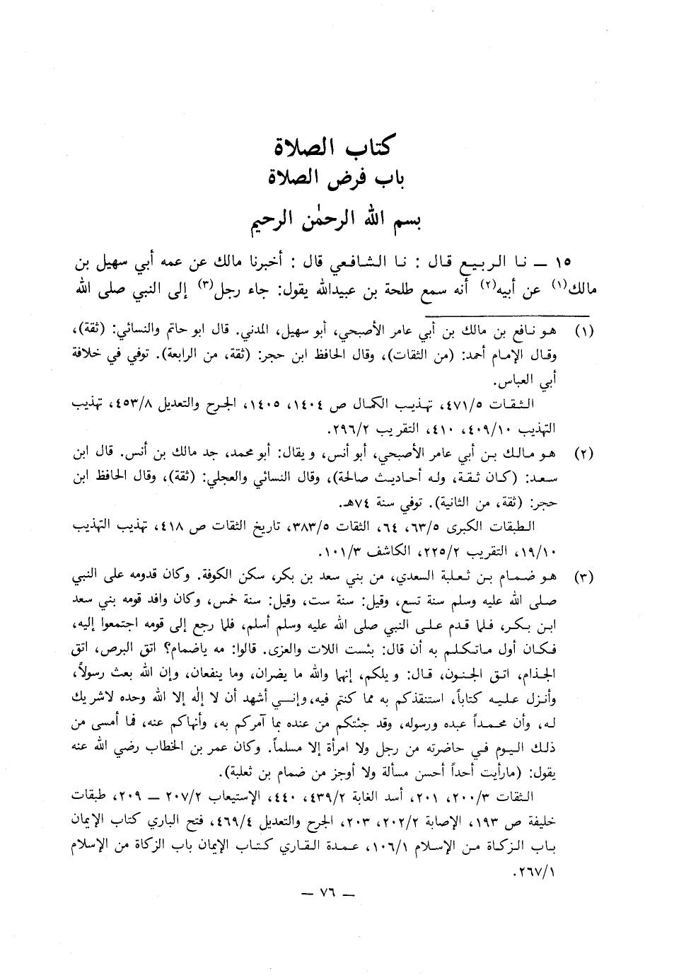 15 - نا الرَّبِيعُ، قَالَ: نا الشَّافِعِيُّ، قَالَ: أَخْبَرَنَا مَالِكٌ، عَنْ عَمِّهِ أَبِي سُهَيْلِ بْنِ مَالِكٍ، عَنْ أَبِيهِ أَنَّهُ سَمِعَ طَلْحَةَ بْنِ عُبَيْدِ اللَّهِ، يَقُولُ: جَاءَ رَجُلٌ إِلَى النَّبِيِّ صَلَّى اللَّهُ