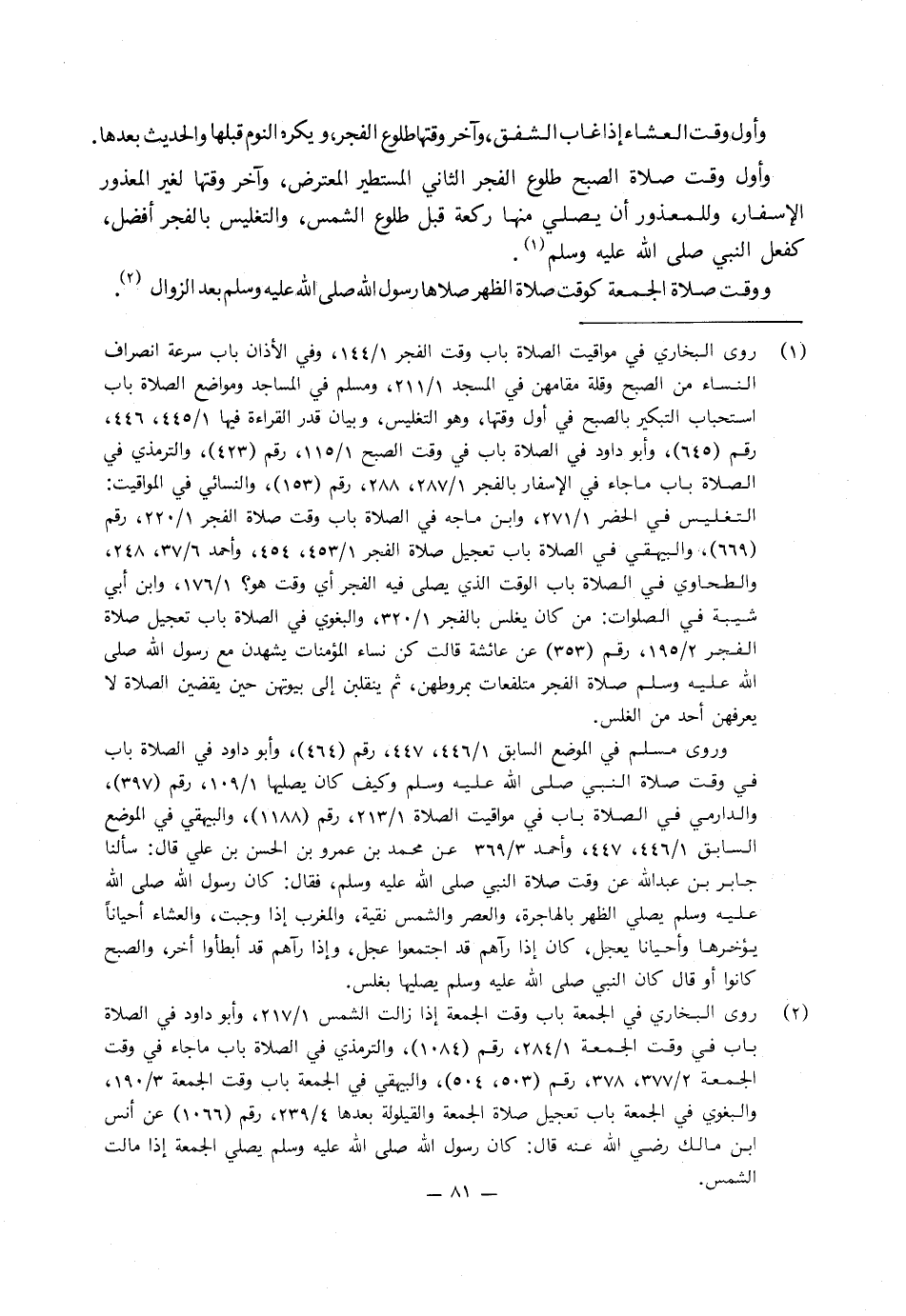 وأول وقت صلاة الصبح طلوع الفجر الثاني المستطير المعترض، وآخر وقتها لغير المعذور الإسفار، وللمعذور أن يصلي فيها ركعة قبل طلوع الشمس، والتغليس بالفجر أفضل، كفعل النَّبِيّ صَلَّى اللَّهُ عَلَيْهِ وَسَلَّمَ، ووقت صلاة الجمعة كوقت صلاة الظهر، صلاها رَسُول اللَّهِ صَلَّى اللَّهُ عَلَيْهِ وَسَلَّمَ بعد الزوال،