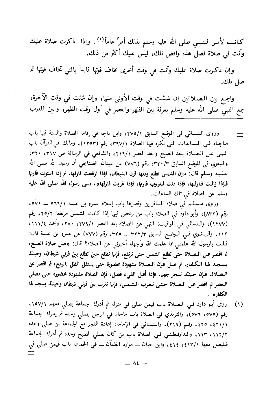 وإذا ذكرت صلاة عليك، وأنت في صلاة فصل هذه واقض تلك، ليس عليك أكثر من ذَلِكَ، وإن ذكرت صلاة عليك وأنت في وقت أخرى تخاف فوتها فابدأ بالتي تخاف فوتها، ثم صل تلك، واجمع بين الصلاتين إن شئت في وقت الأولى منها، وإن شئت في وقت الآخرة، جمع النَّبِيّ صَلَّى اللَّهُ عَلَيْهِ وَسَلَّمَ بعرفة بين الظهر والعصر في أول وقت الظهر، وبين المغرب