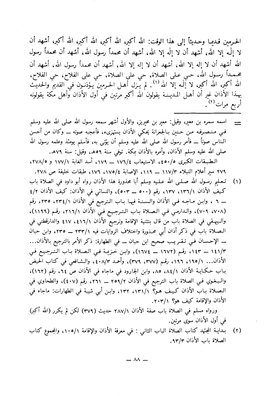 الحرمين قديمًا وحديثًا إِلَى هذا الوقت: «اللَّه أكبر اللَّه أكبر اللَّه أكبر اللَّه أكبر، أشهد أن لا إله إلا اللَّه، أشهد أن لا إله إلا اللَّه، أشهد أن محمدًا رَسُول اللَّهِ، أشهد أن محمدًا رَسُول اللَّهِ، حي عَلَى الصلاة، حي عَلَى الصلاة، حي عَلَى الفلاح، حي عَلَى الفلاح، اللَّه أكبر اللَّه أكبر لا إله إلا اللَّه» .